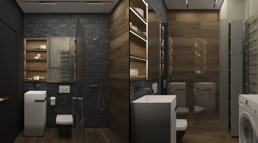 A textural black stone wall makes up the main portion of the bathroom, and wood cladding defines the other.