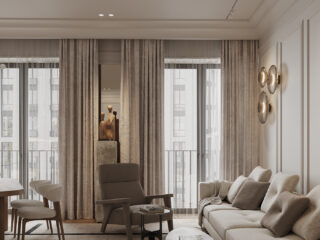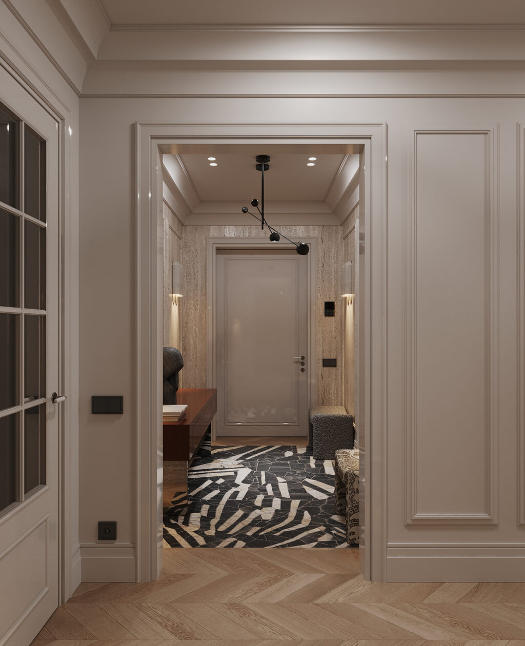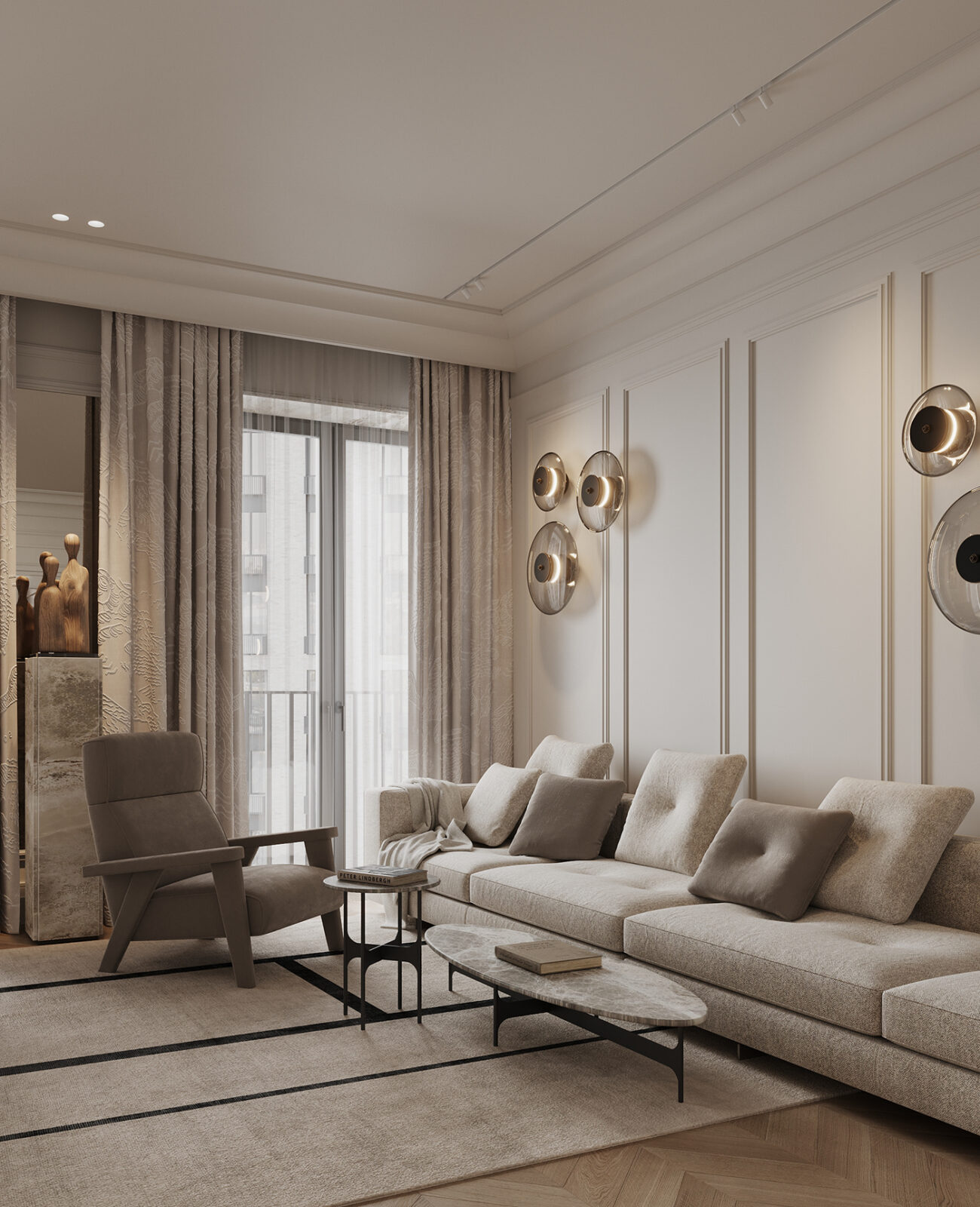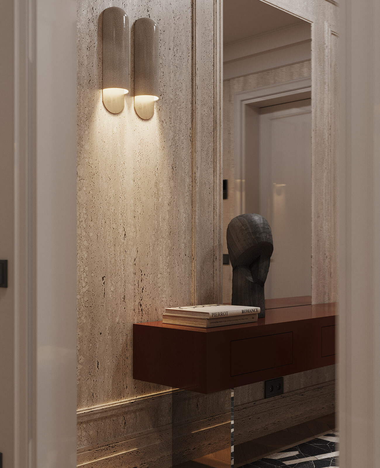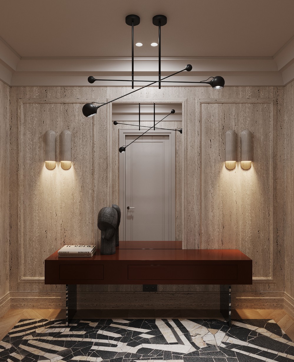 Behind it all, the wall becomes part of the composition (think soft panel detailing, subtle moldings, and clean ceiling lines). Best of all, the sculptural wall lights read almost like art; glowing forms that shift the mood as evening sets in.