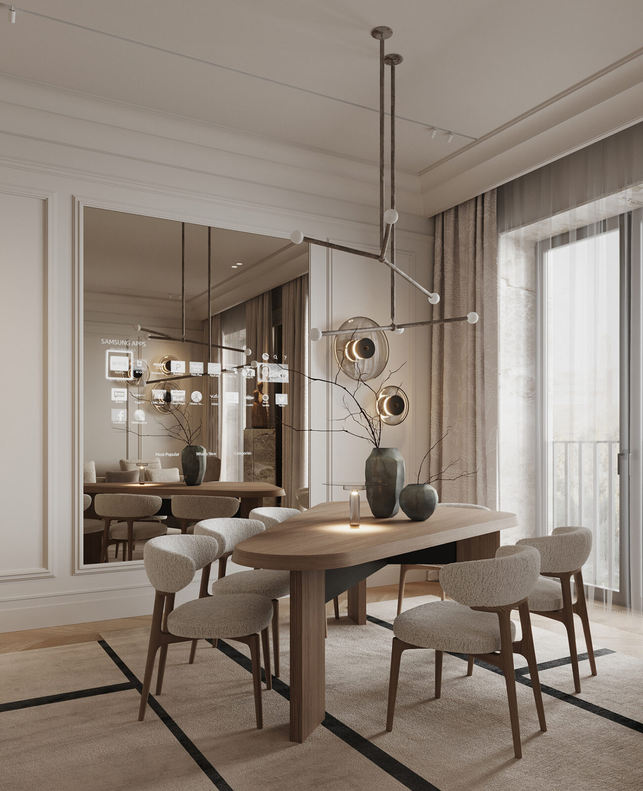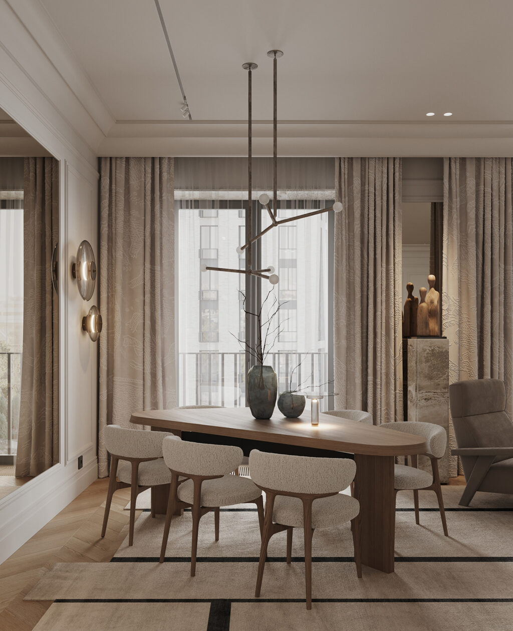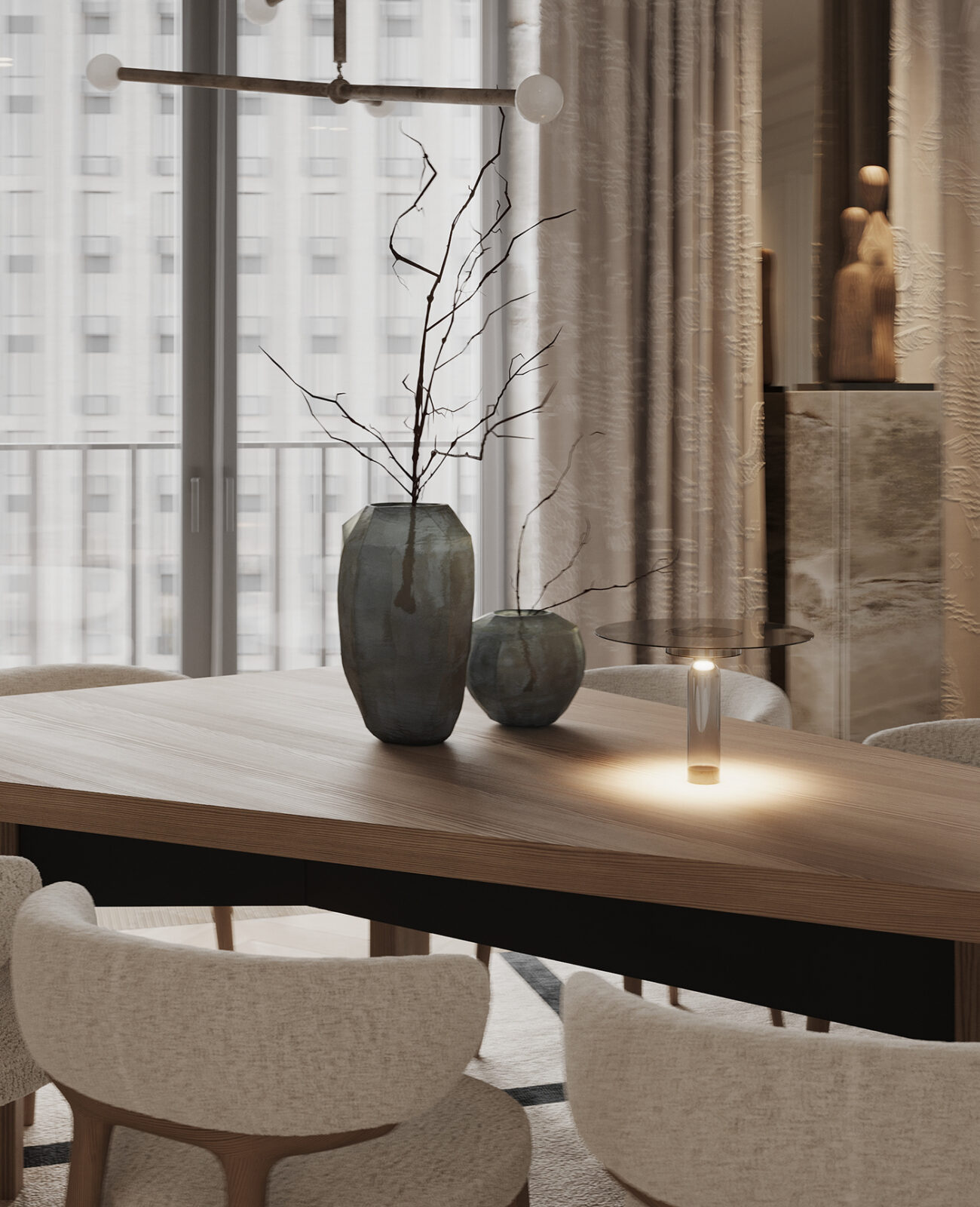 The oval wood table is the centerpiece, softened by sculptural chairs that invite long, comfortable meals. Overhead, the linear pendant adds just enough drama, while the textured drapery filters light into a calm, even glow. Then, the branch-filled ceramic vases bring an organic pause to the setting.