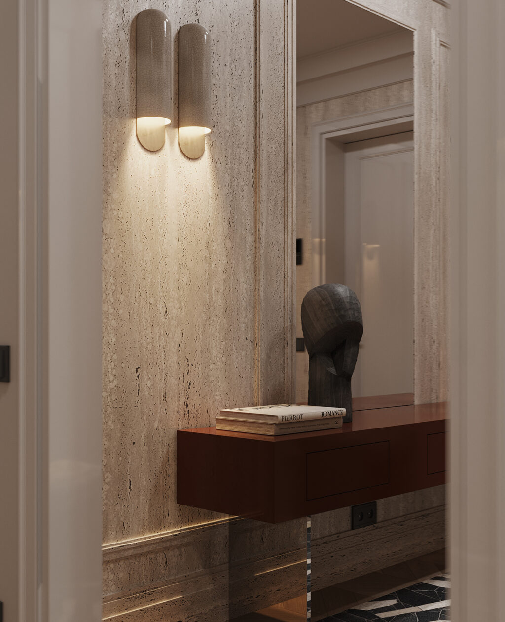 Travertine-clad walls exude an architectural vibe, and slim wall sconces have been used to soften the stone surface. That deep maroon floating console anchors the space. It’s storage, yes, but it reads like a sculptural element. The rich finish brings contrast against the pale walls, with clean-lined drawers keeping clutter out of sight.
