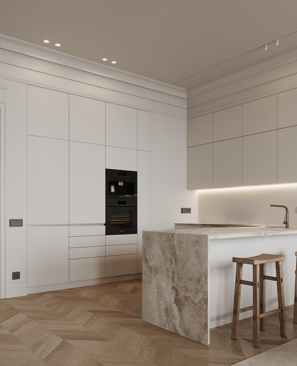 In the heart of the home, flat-front cabinetry runs wall-to-wall, allowing the otherwise utilitarian space feel architectural. The soft, tonal palette does the heavy lifting, while under-cabinet lighting adds a warm glow.