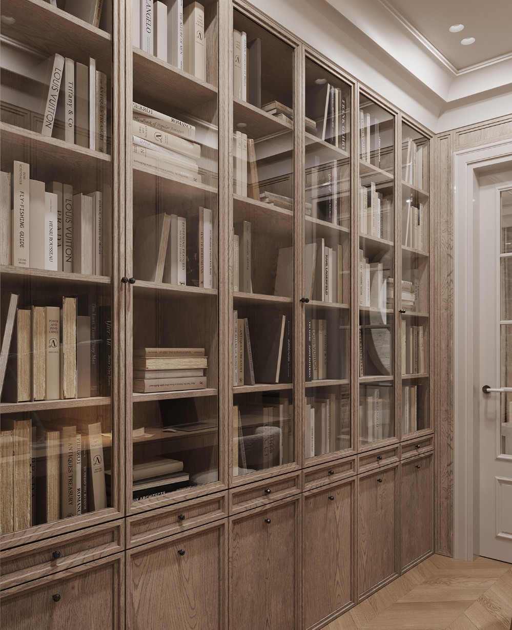 Glass-front cabinetry lines one side, turning storage into a visual element rather than something to hide. Books, objects, and soft reflections add a lovely decorative layer. The glass-paneled door filters light from outside, so the room stays connected yet preserves a sense of privacy.