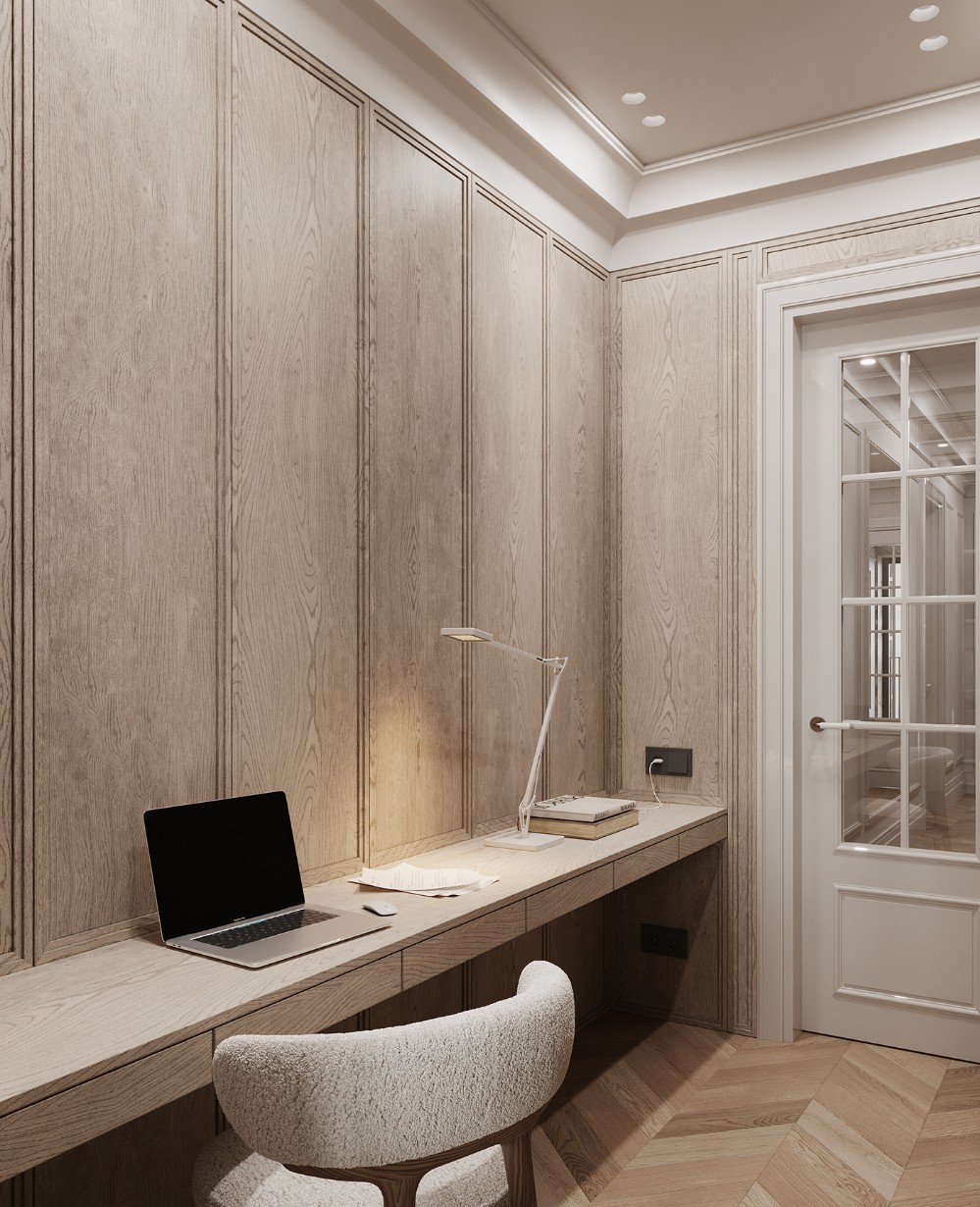 Wrapped in warm oak paneling, the built-in desk keeps the footprint slim. Everything sits tailored, ensuring nothing breaks the calm rhythm.