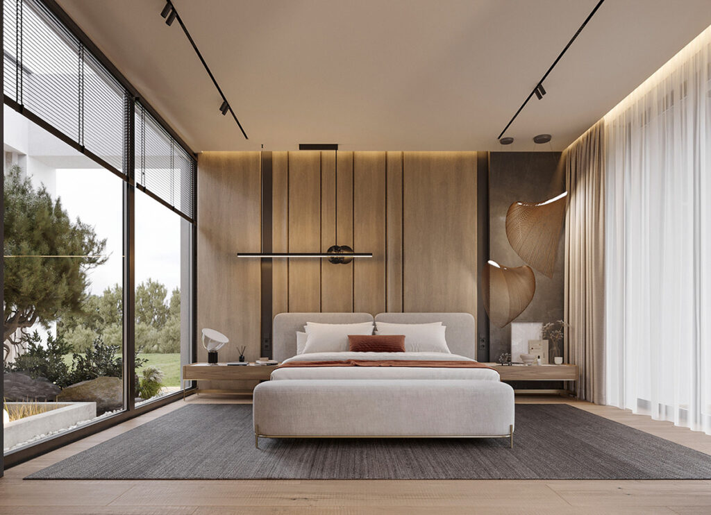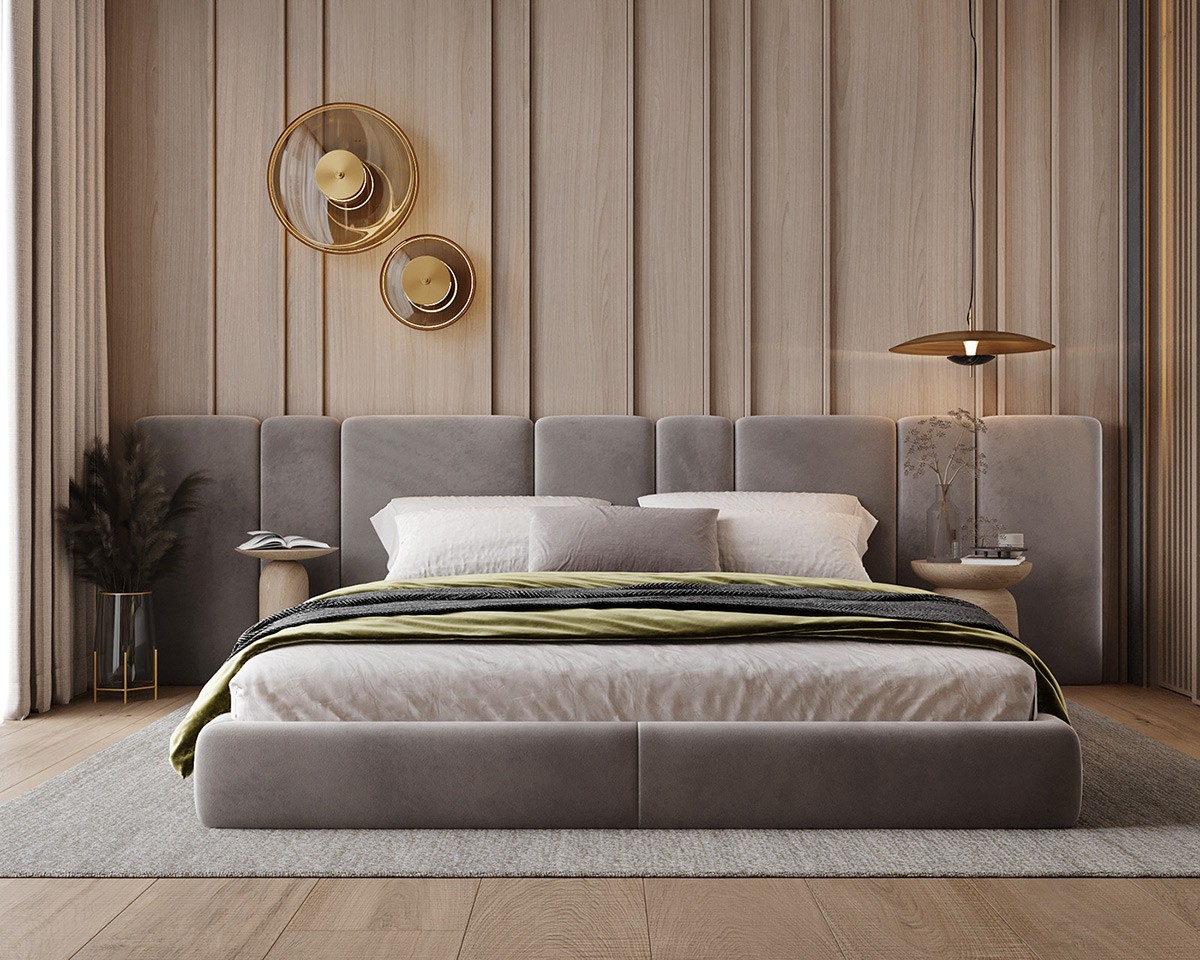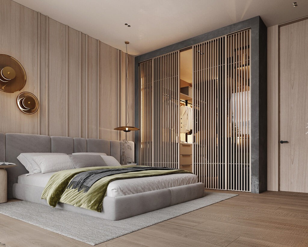 This bedroom is as cozy as it gets. A velvet-upholstered bed against a wooden accent wall takes center stage. The slat wood partition with the closet offers functionality, sure, but also adds warmth to the space. It goes without saying that the open closet is suuuper luxurious!