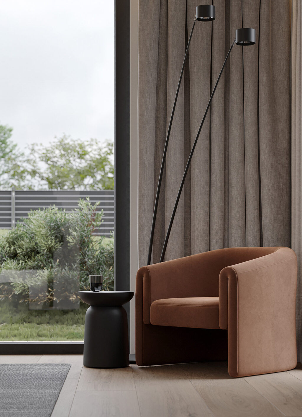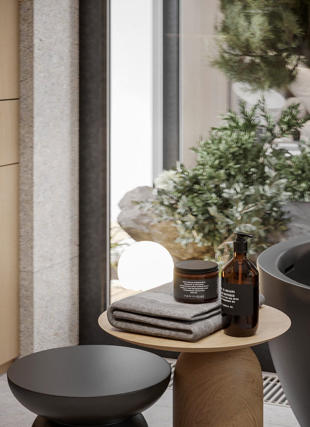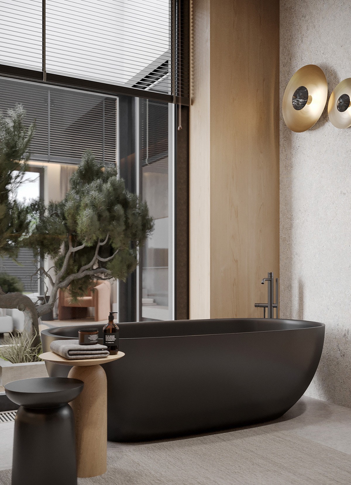 When a matte black standing tub is placed next to a massive window, the end result is a luxe spa-like bathroom.