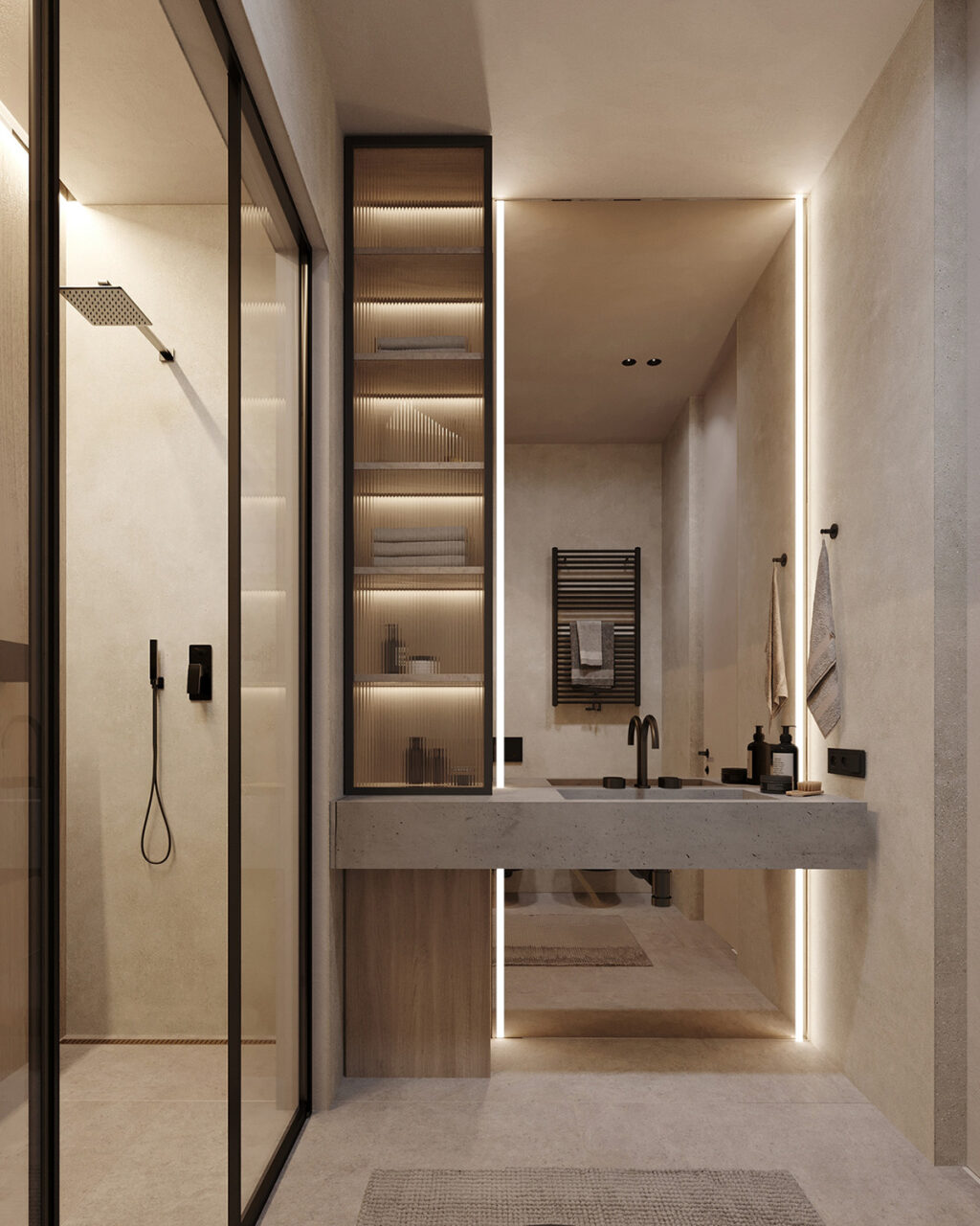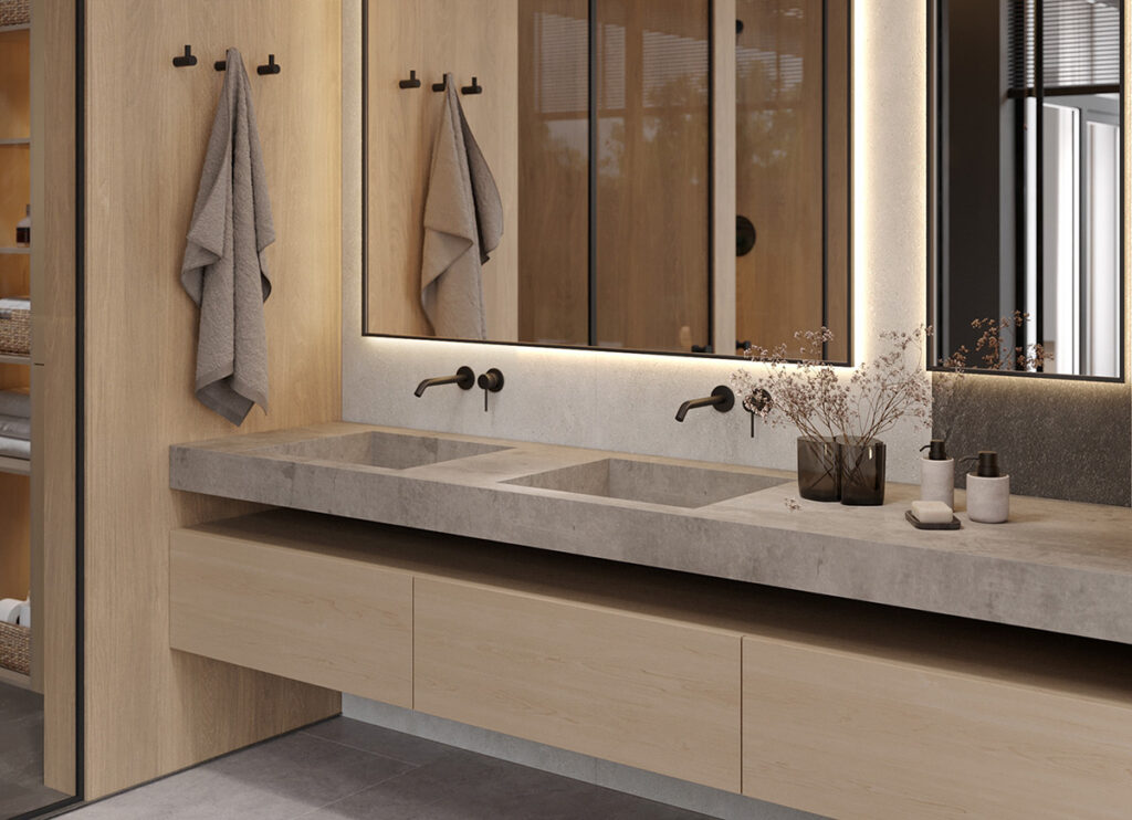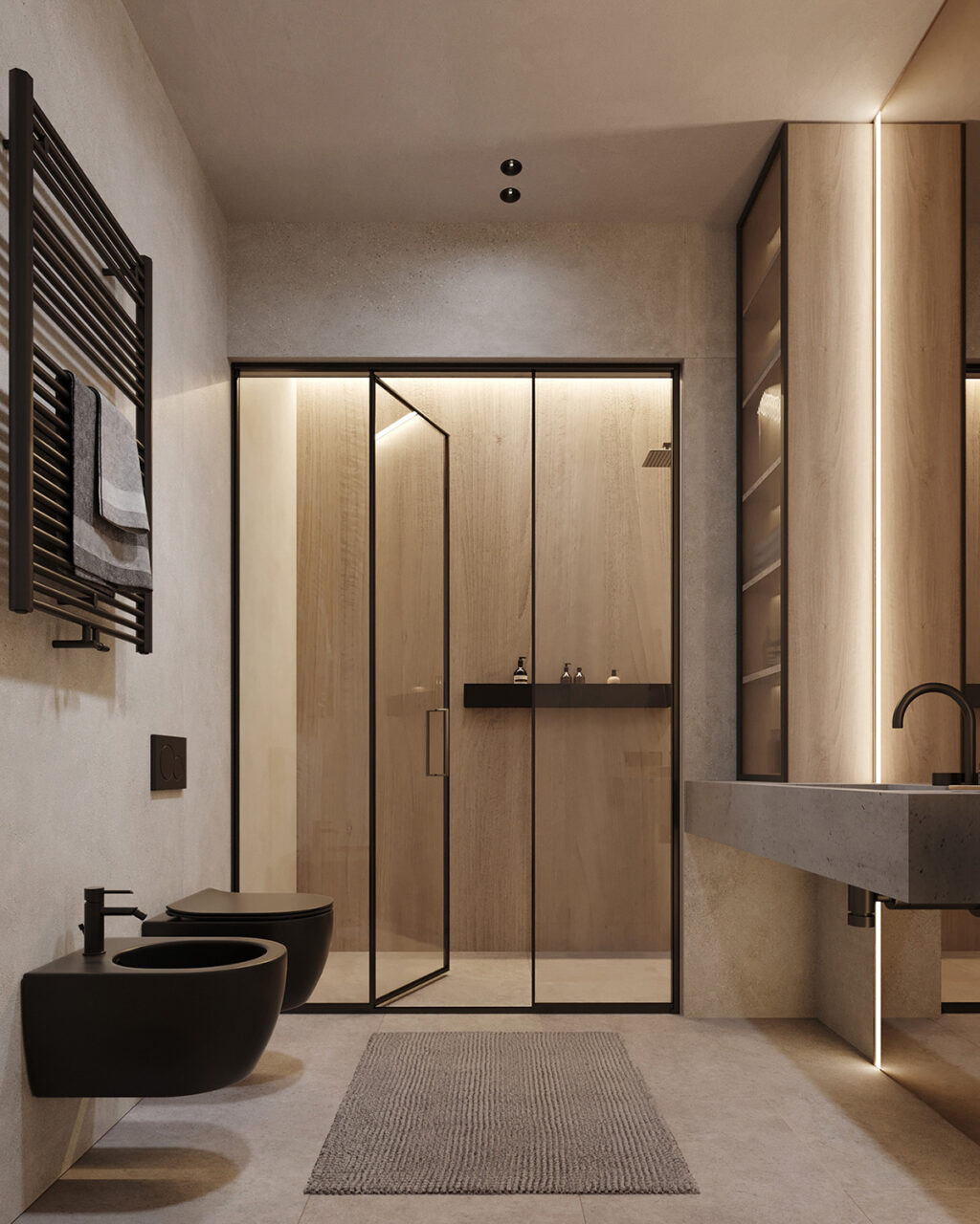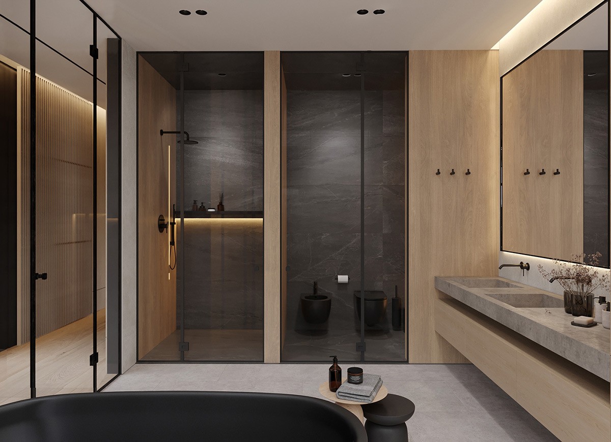 When it comes to functionality and style… this bathroom takes the prize! Two matte black wall-mounted toilets—and a similar style standing tub—add opulence. We see a separate cubicle for the shower, while the vanity and cabinetry are equal parts functional and stylish. A special mention for the large plants bringing the outdoors in.
