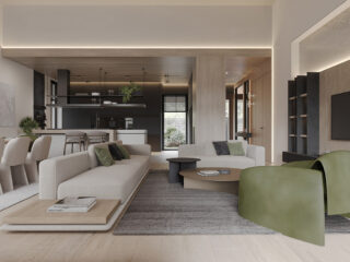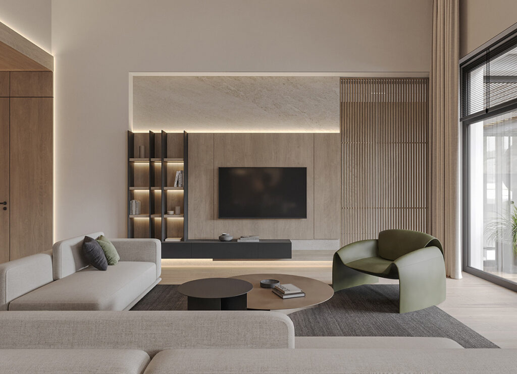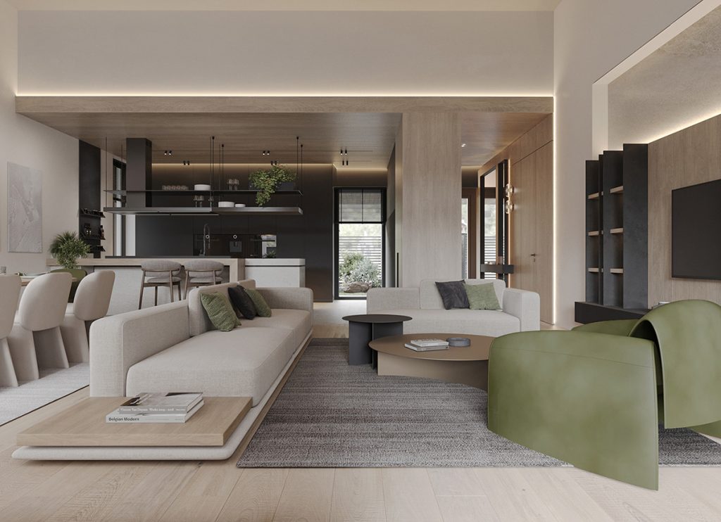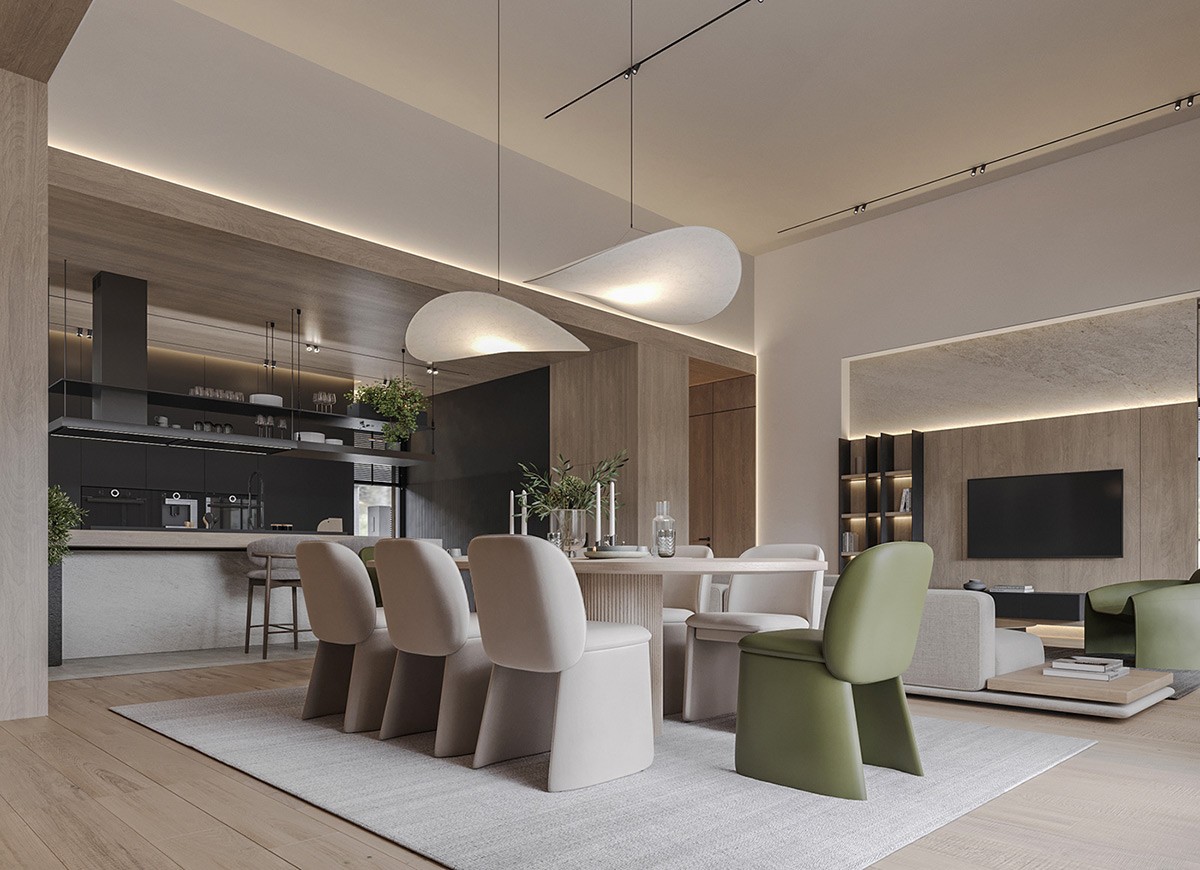 In the open living and dining area, the base is set with soft neutrals complemented by olive green accents. With recessed lights around the ceiling perimeter and backlit shelving, we see beautifully layered lighting. The oversized sofas with clean lines are paired with green armchairs in the living area. A similar color palette is seen in the dining room, where chunky green end chairs create a statement. Throughout the space, potted plants tie the interior with nature.