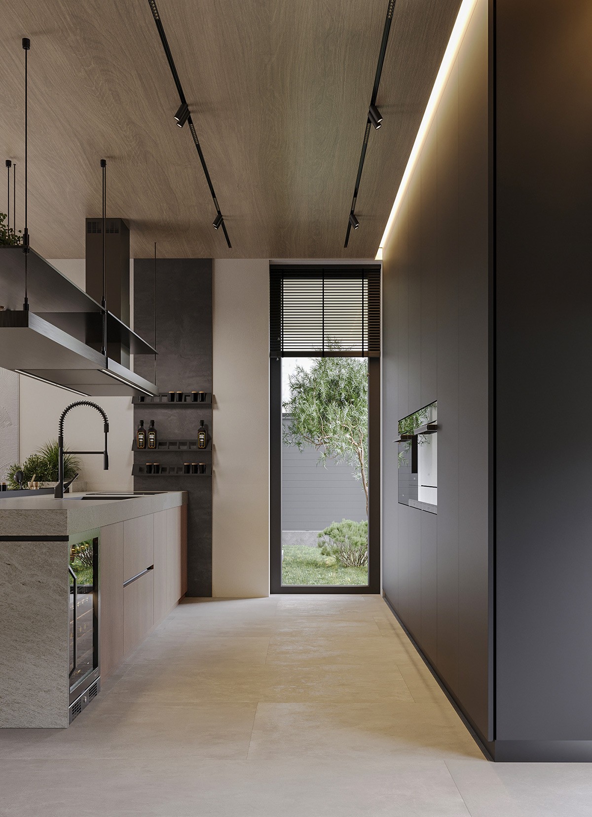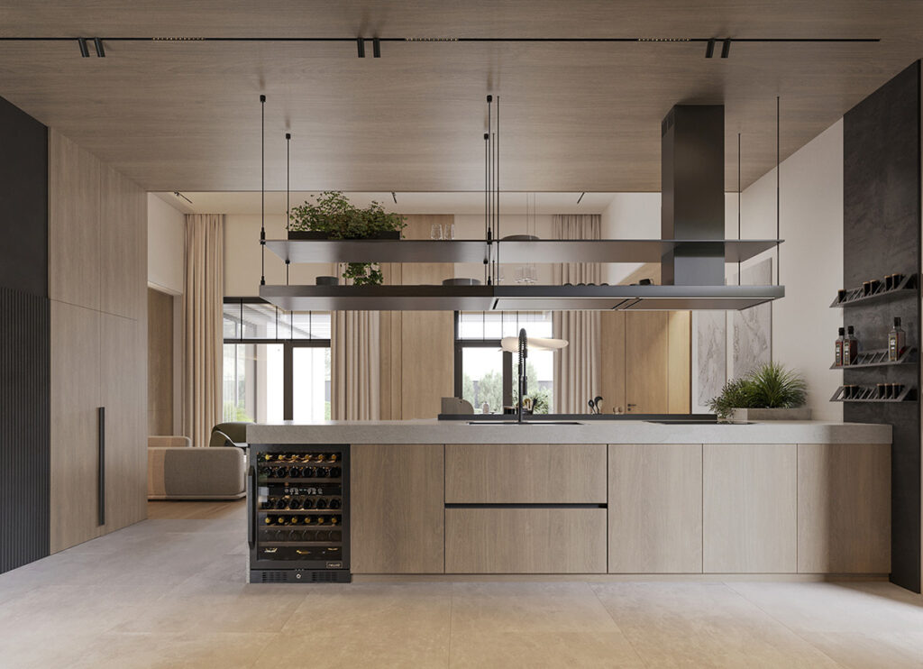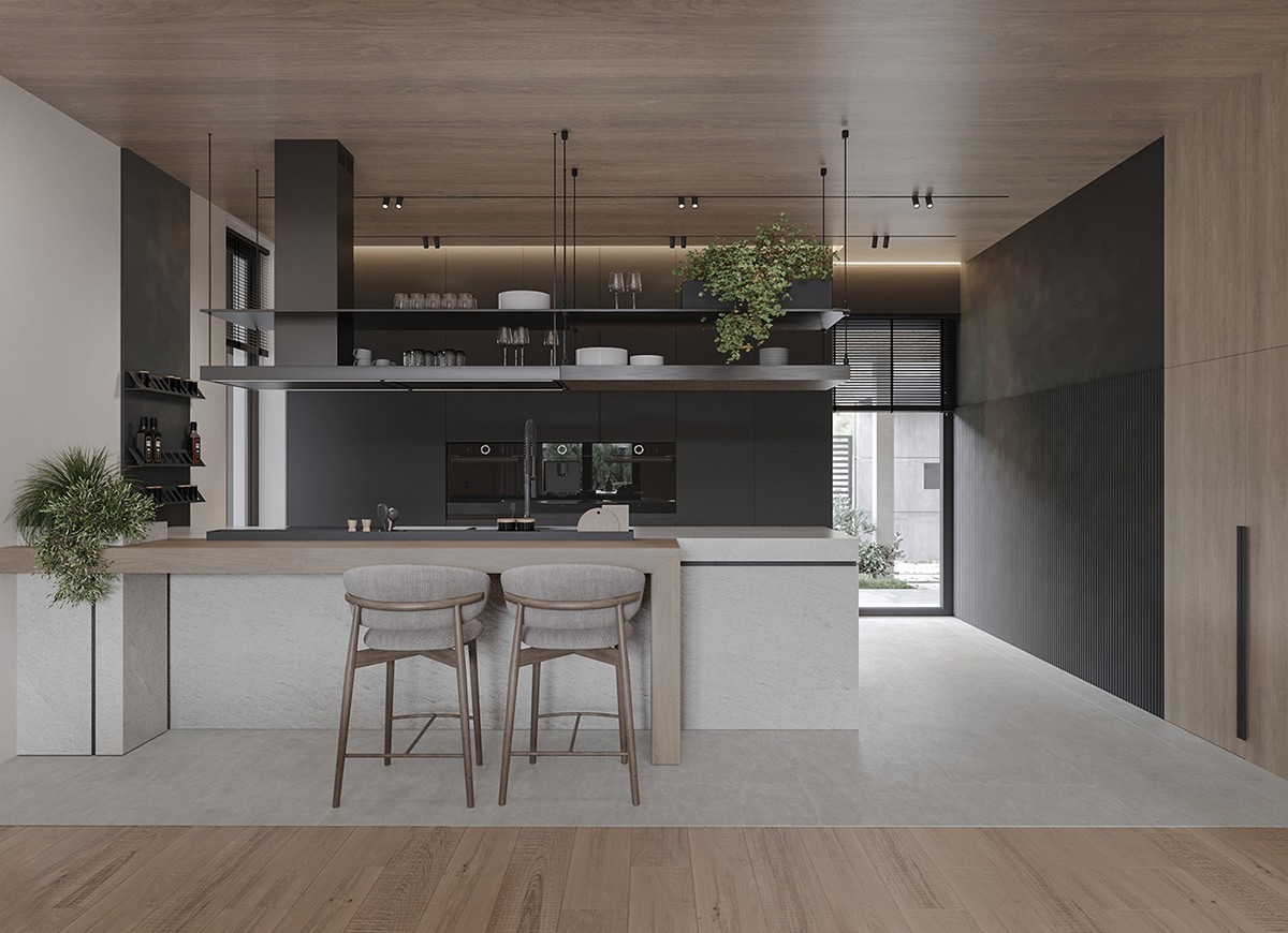 The kitchen sees a mix of warm wood and black accents (these factor in luxury). A mini bar provides ample room to store your favorite drinks. We especially love the hanging shelving—letting you store essentials while saving space.