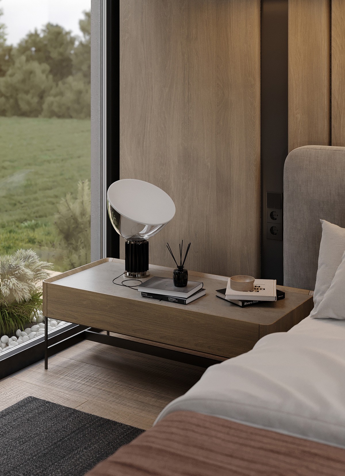 The floor-to-ceiling windows in the bedroom give scenic outdoor views (these smartly double as decor 😉). The floating nightstands are super-savvy—and equal parts classy. Finally, the interesting pendant lights and floor lamp add intrigue.