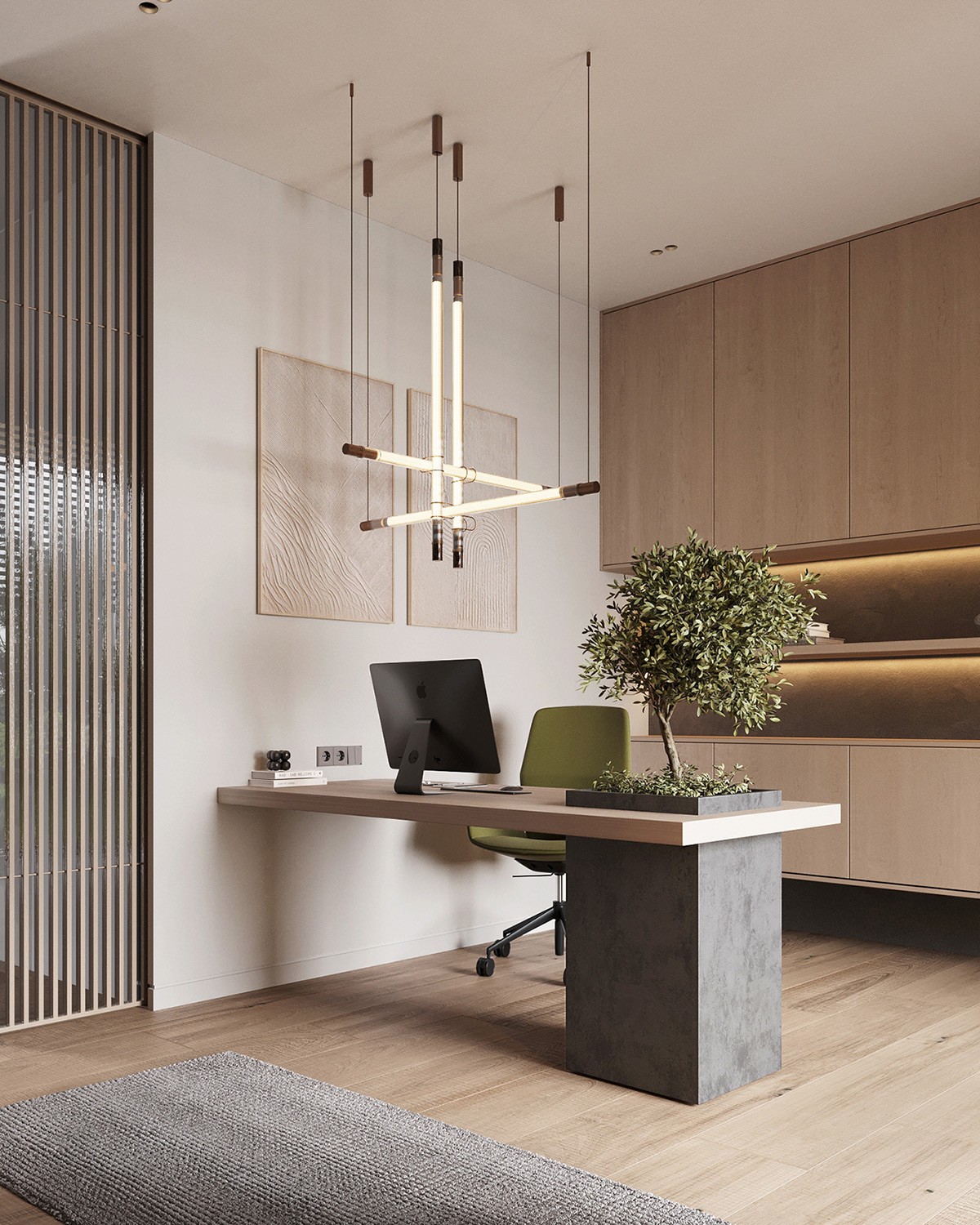 Who dreads work hours when the office looks like this? A wooden desk is paired with an ergonomic green chair. The standout feature is a small tree planted within a built-in planter on the desk 💚 Behind this setting, we see light oakwood cabinetry providing room to stock all essentials.