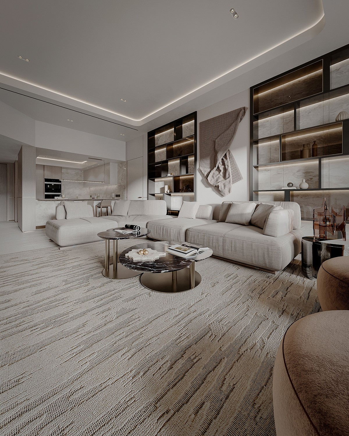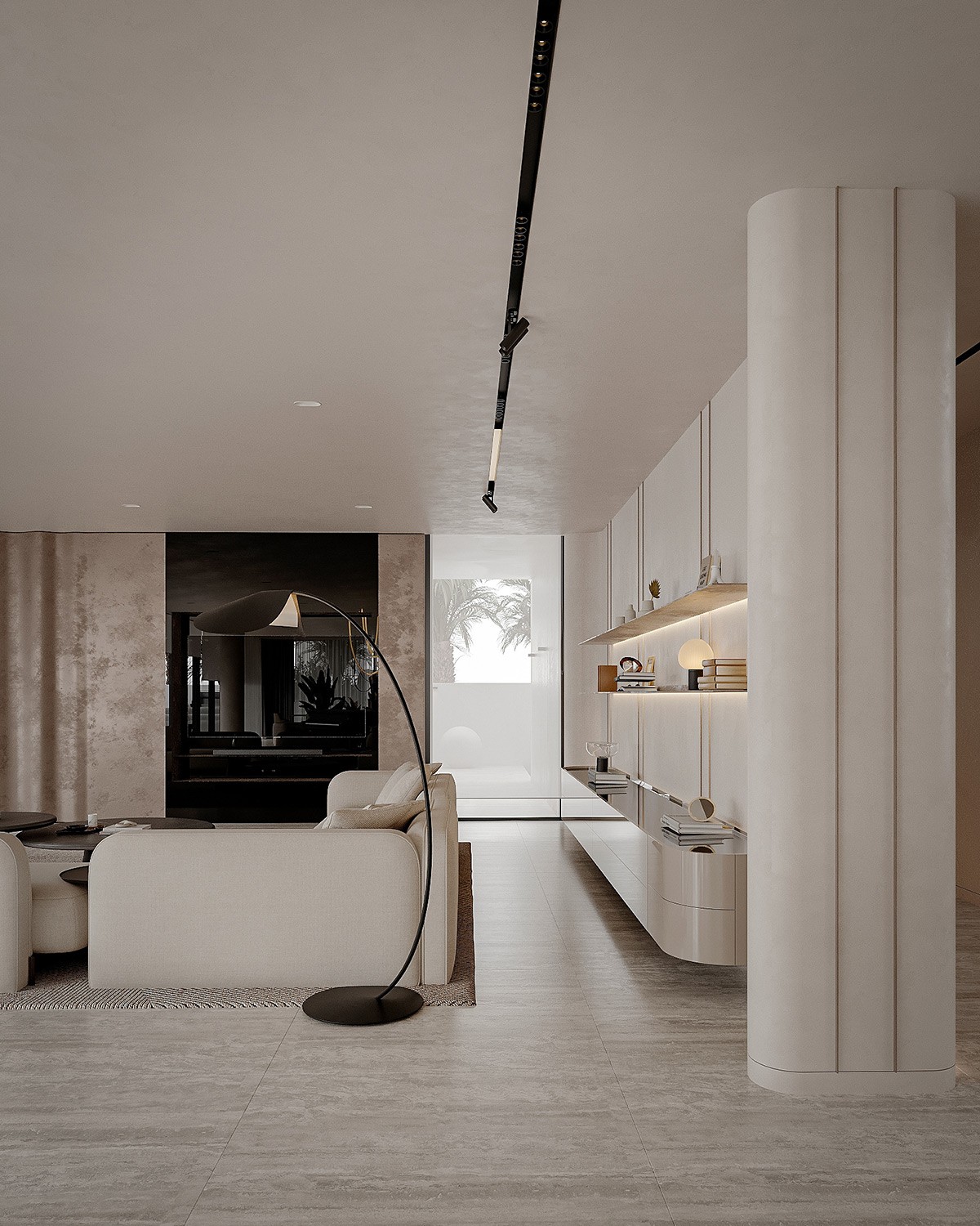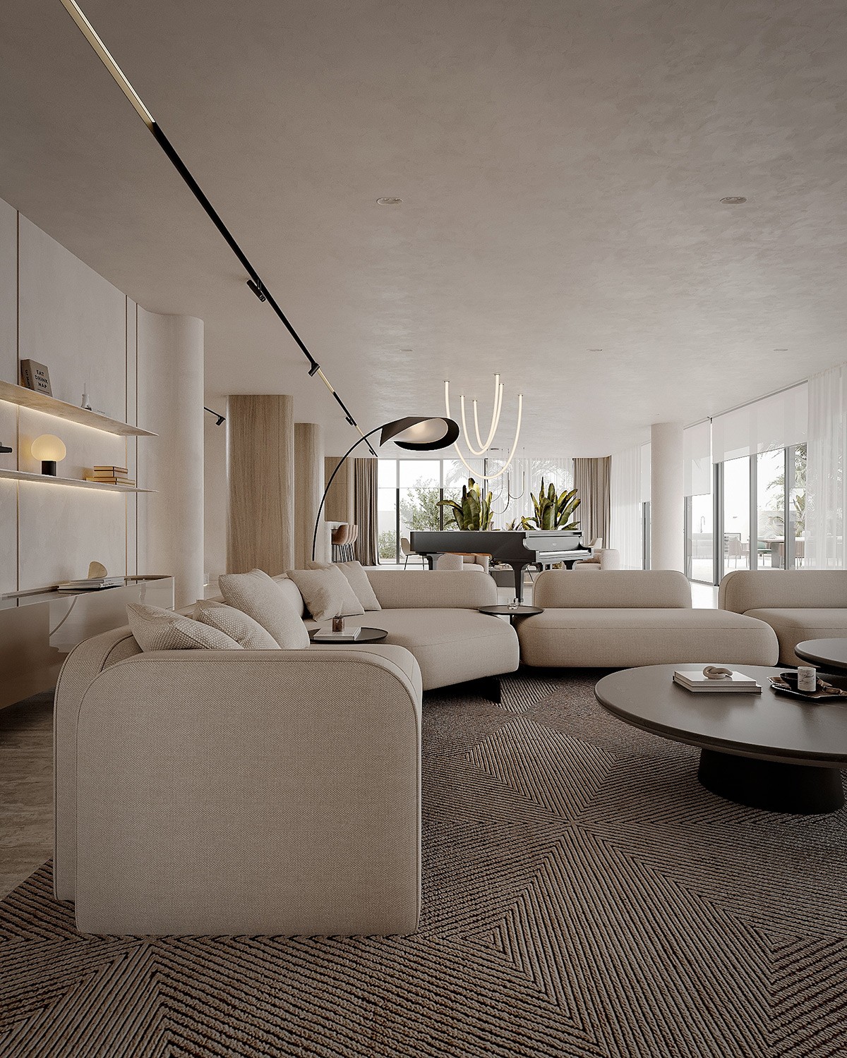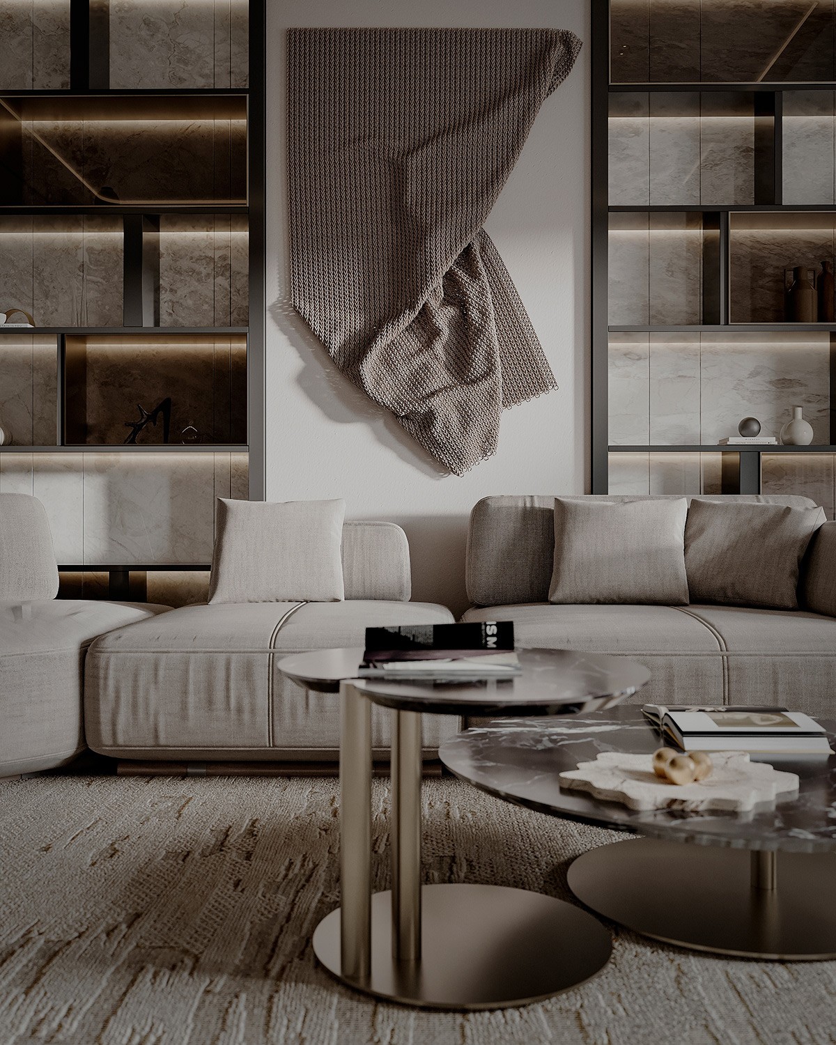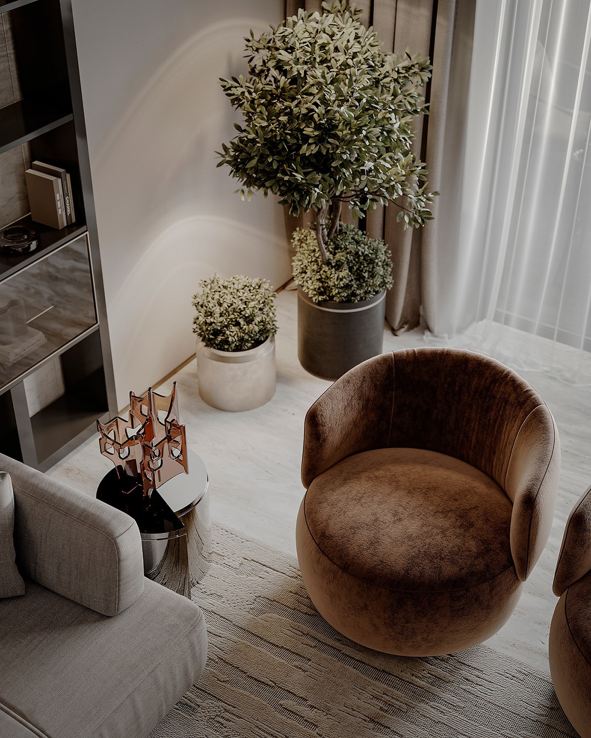 Beige decor radiates an aura of understated elegance and timeless beauty. In the realm of modern living spaces, this versatile hue has garnered tremendous favor for its ability to create a refined and sophisticated ambiance. Using the subtle warmth of soothing neutrality, beige home interiors offer serene settings for relaxation, contemplation, and peaceful family connection. In this article, we invite you to delve into 3 elegant beige living spaces, each expertly visualized by Julia Tkachenko. We’ll look at how dark accents help to anchor a light beige living room scheme, how thoughtful furniture selections boost ordinary spaces into high-end sanctuaries, and how creative lighting installations are truly transformative.