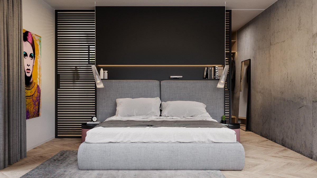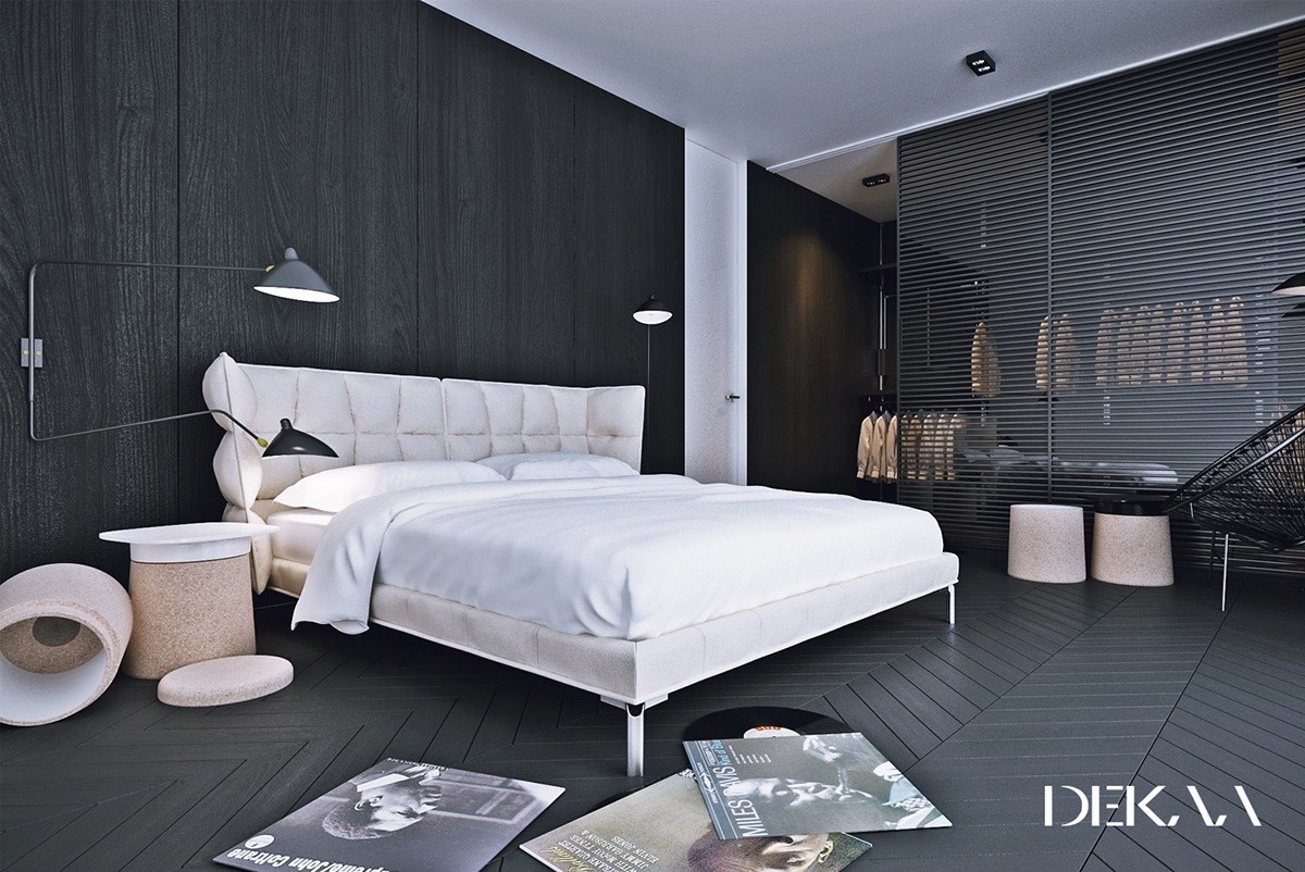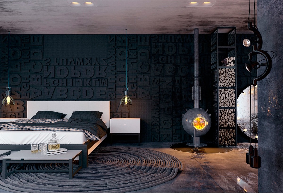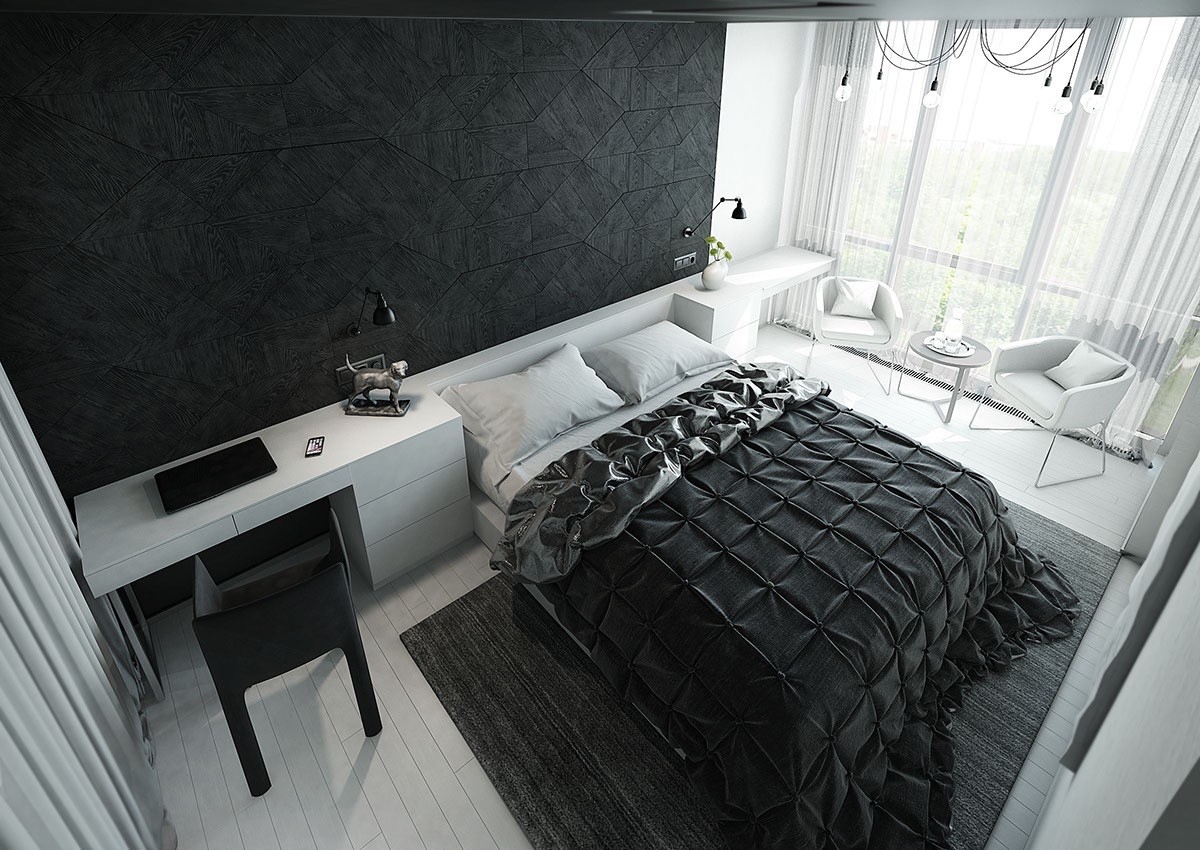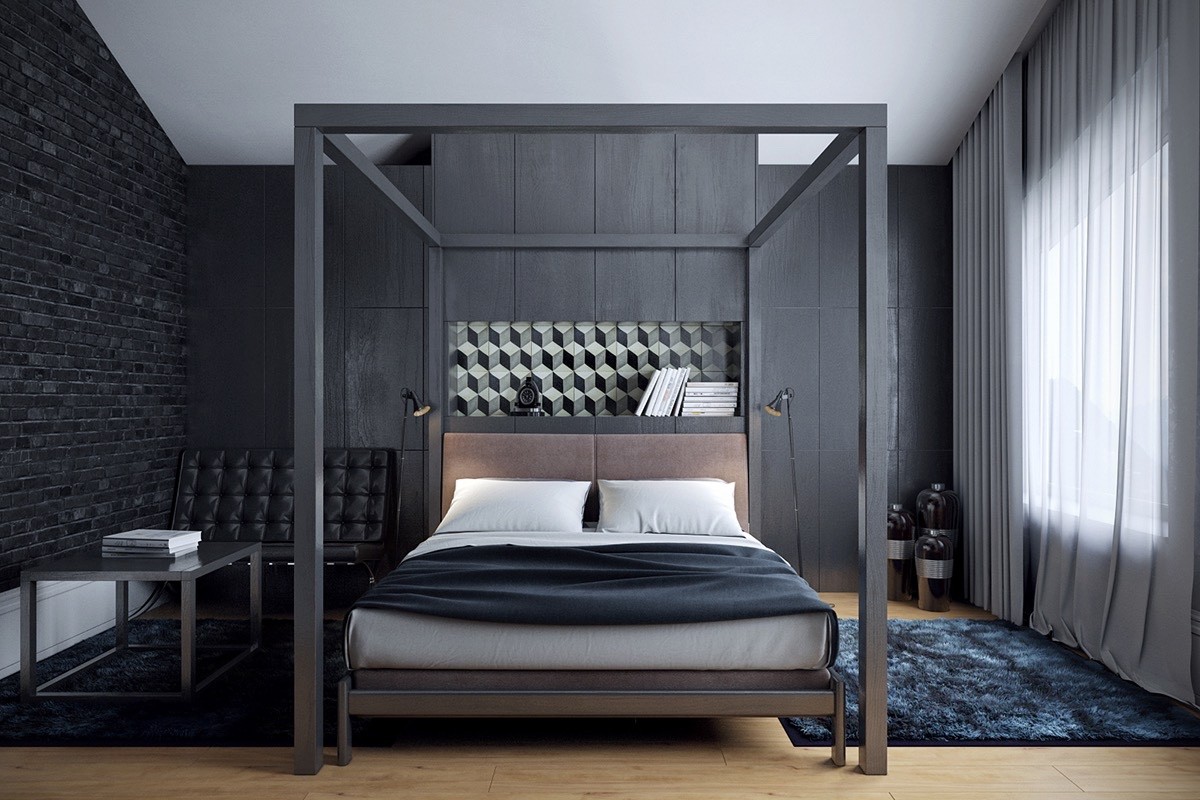 Go black with brickwork. Exposed brick has been painted over in this black and gray bedroom, so that the texture can still be seen. The wall acts as zoning decor for a small bedroom lounge area. The brick texture is complemented by geometric pattern in a niche behind the bed.