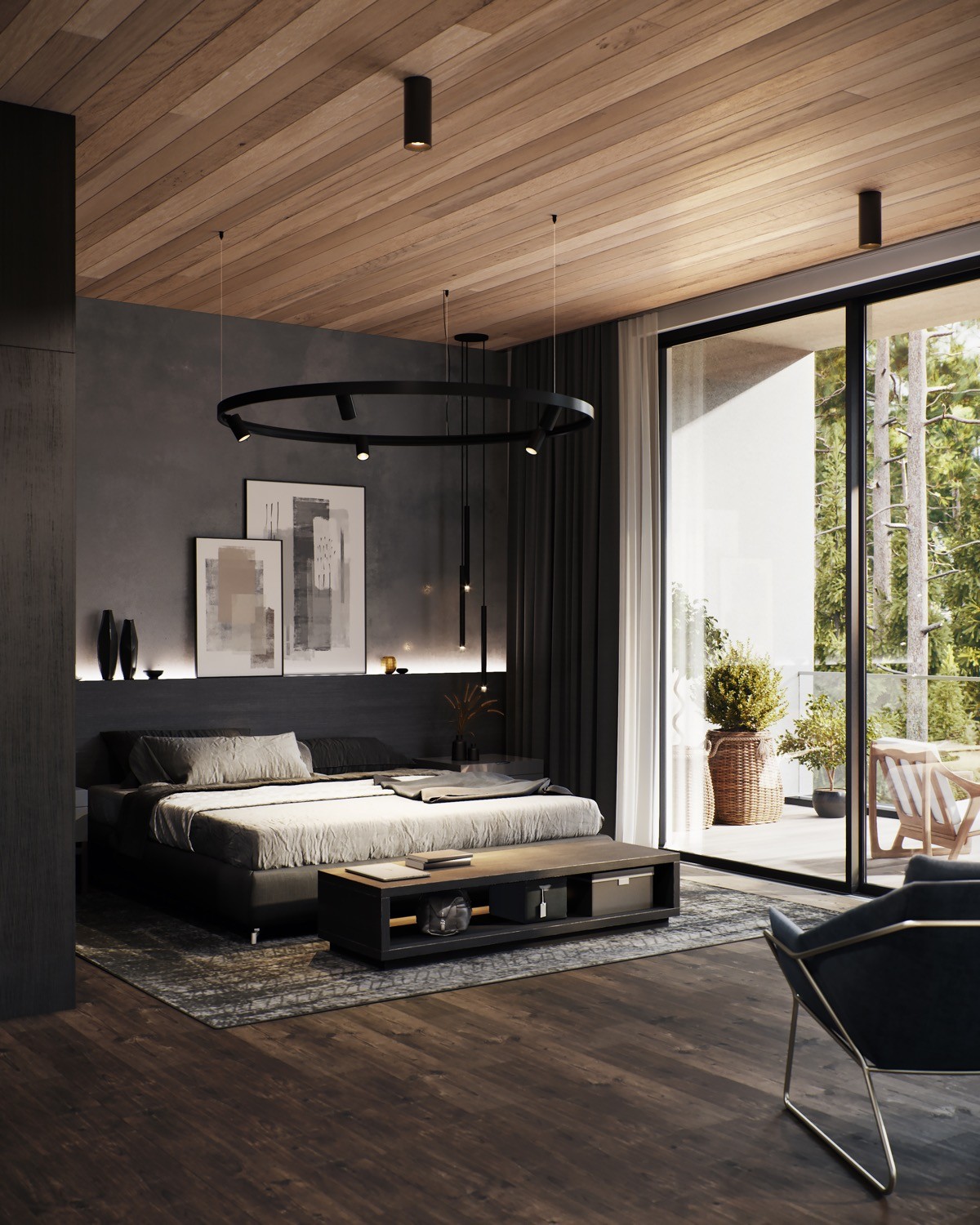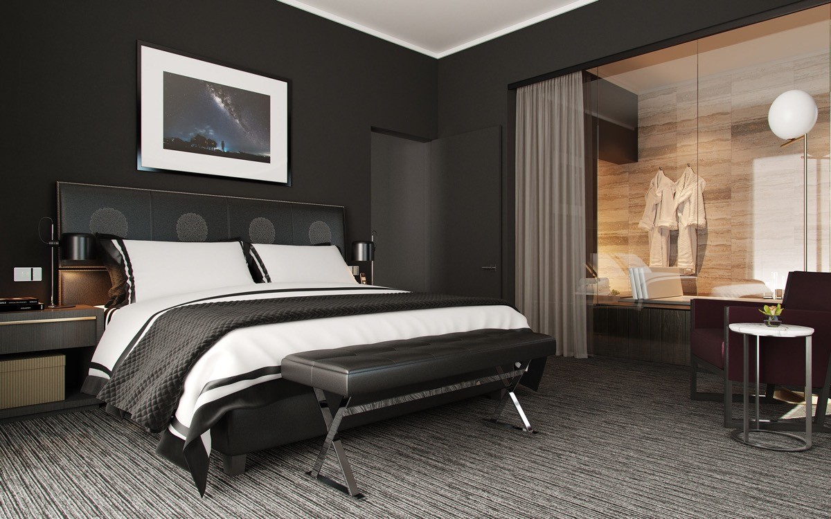 Quietly lighten an all black bedroom with low grey wall panelling and a pale grey rug. A light colored bedroom chandelier can make it stand out against the dark backdrop.