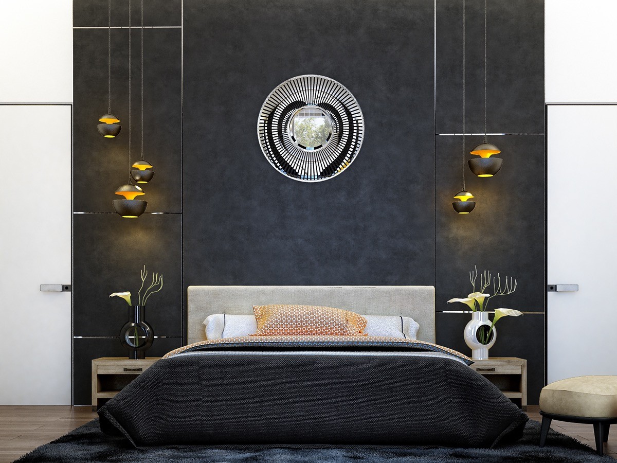 Reflect light into dark coloured rooms with mirrors. Situate a stripe of mirror behind one or both bedside units. A floor to ceiling strip of glass will go a long way in bouncing extra natural light around your interior.