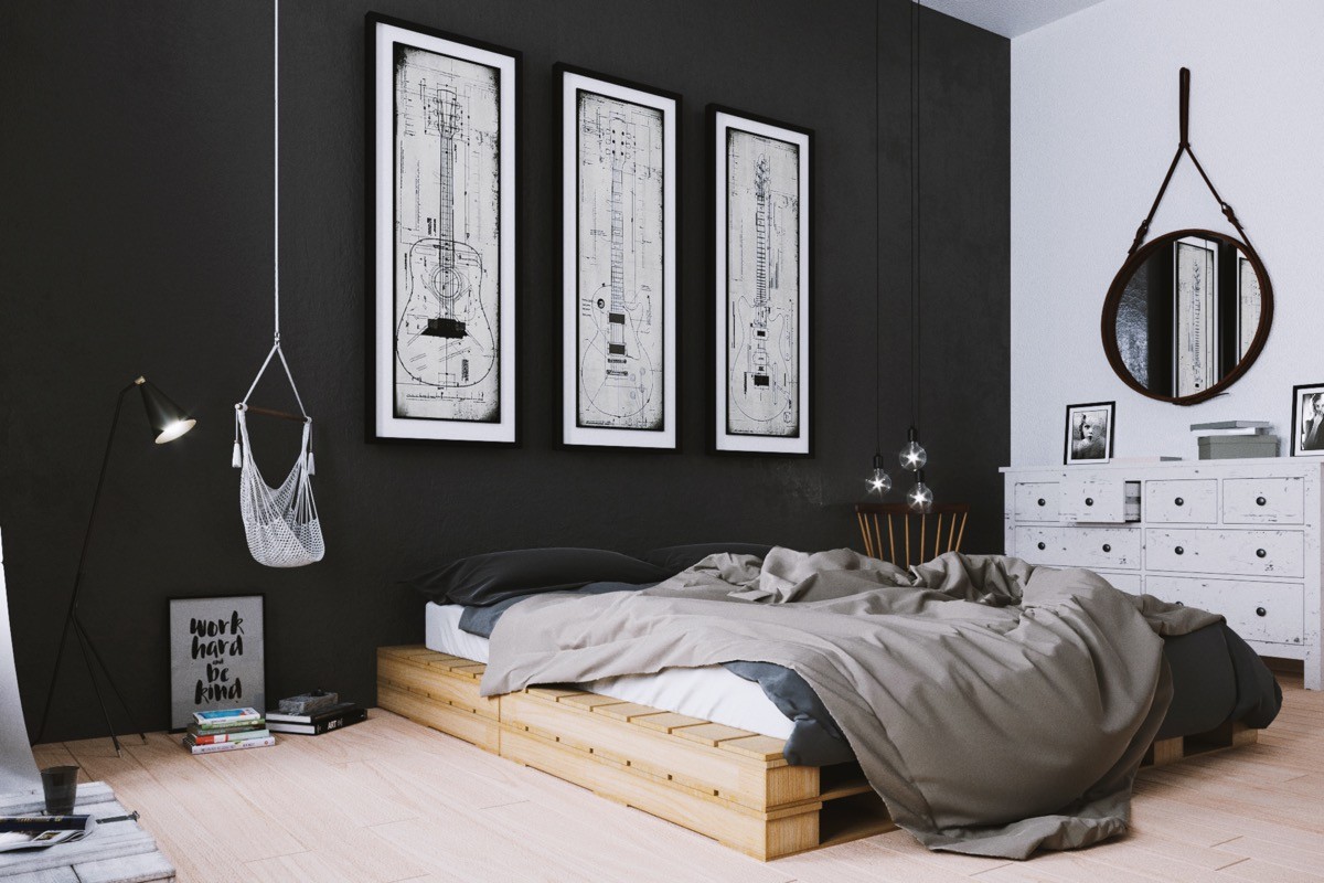 Throw together a cool bedroom with a black feature wall, a reclaimed pallet bed and music themed art.