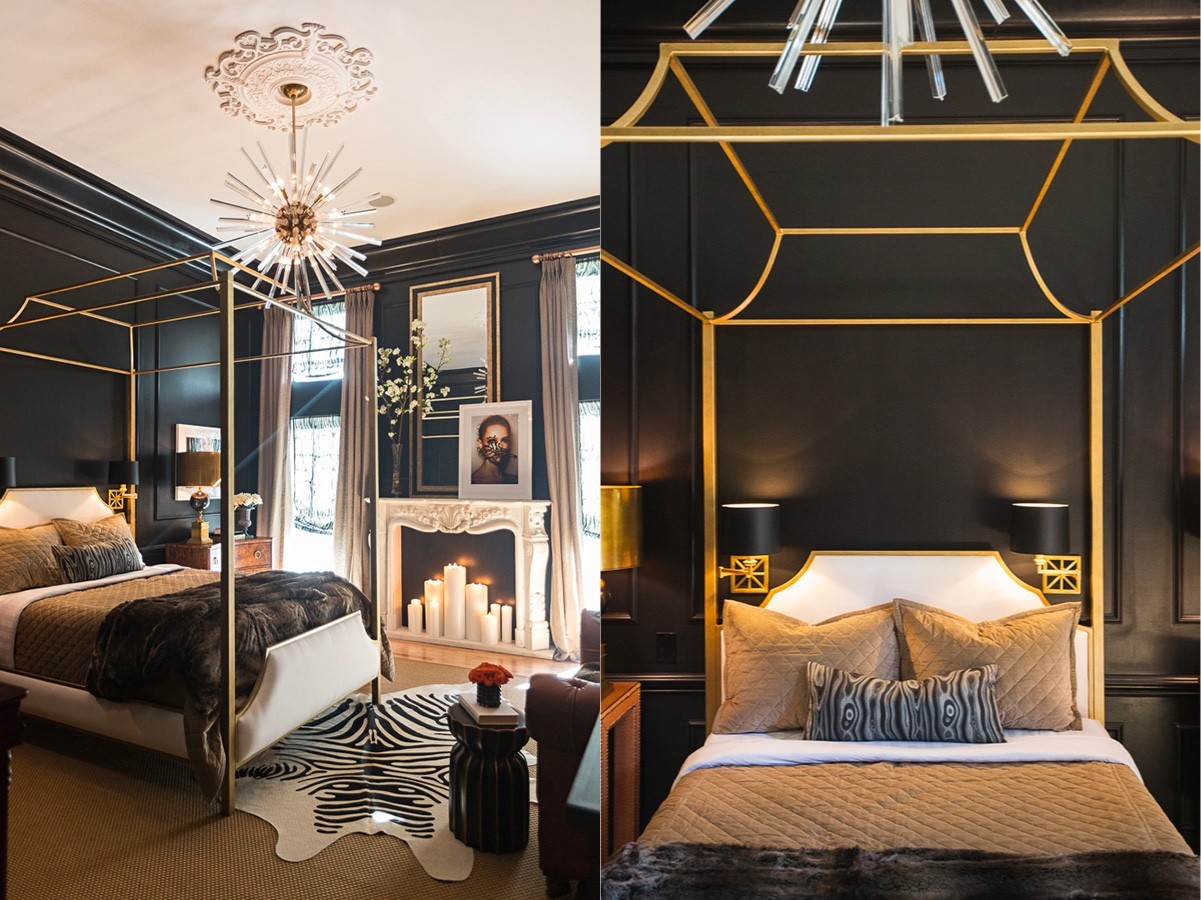 Dark decadence. Nothing has quite the same depth of decadence as a black and gold bedroom. Push it up a notch or two with a gold four poster bed and black boiserie. Notice the unusual placement of a fireplace between the windows too. The decorative surround houses a group of pillar candles - though always remember to keep lit candles away from draughts and curtains.