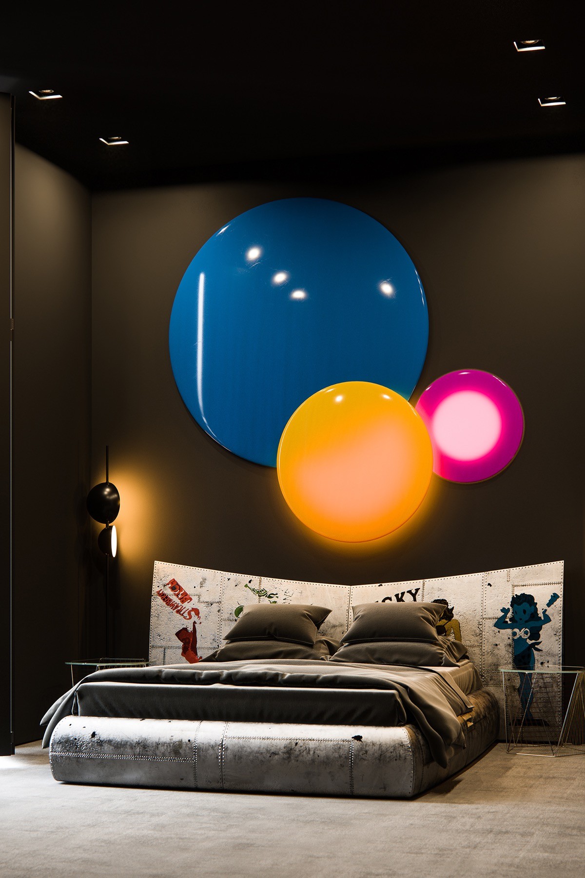 Black makes a perfect backdrop. When walls are knocked back in black, you can go wild with colourful accessories, like this tricolour light installation. Black also makes a good base for standout furniture pieces like this unique painted bed.