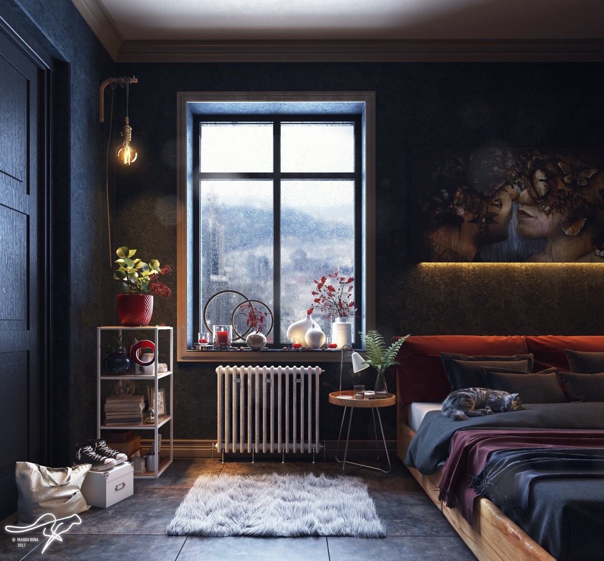Dark dressed eclectic. This interesting mix of modern and classic pieces are held tightly together by the strong colour scheme. The tufted bed gives off an air of sophistication.