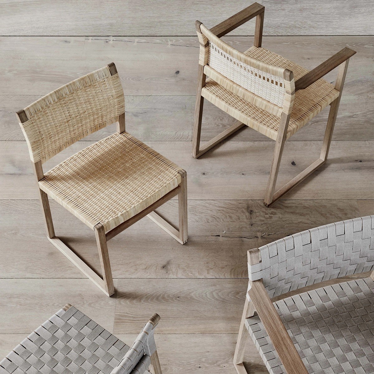 Legendary Danish furniture designer Børge Mogensen originally created the BM61 Cane Chair in 1958, its streamlined silhouette and attention to detail making it a lasting favorite among designers today. The sturdy oak structure is available in a lacquered or oiled finish, the backrest and seat made from handwoven cane rattan.