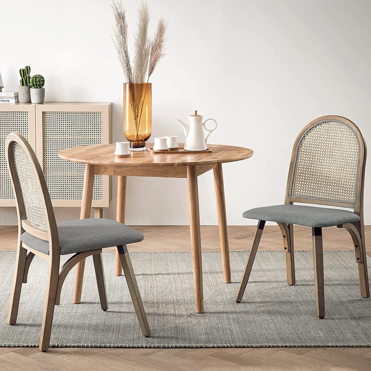 Keep things light and simple with this uncomplicated side chair set. Each piece features clean lines and vintage-inspired finishes. Select the distressed white or grey finishes for a rustic look, or choose dark oak to suit a more mid-century decor theme. Synthetic rattan makes the cane backrests especially resilient against everyday wear.