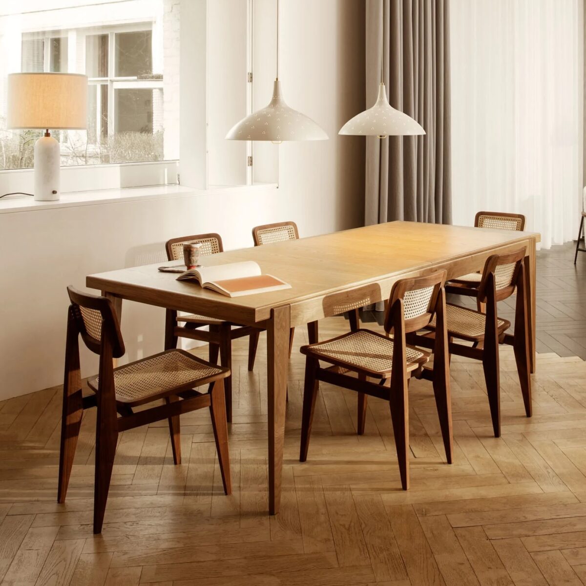 Designed by Marcel Gascoin in 1947, the popular C-Chair is a mid-century icon that offers timeless sophistication for a wide range of dining room themes. These chairs feature compact footprints for space-conscious design, the caned backrest and seat providing subtle give for comfort.