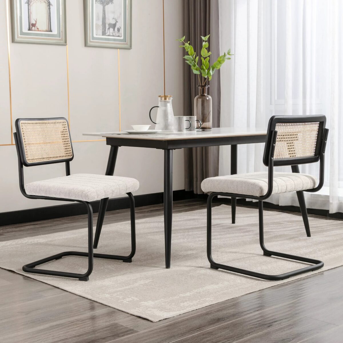 Rattan is tightly woven to give this chair backrest a more fabriclike appearance, solid yet wonderfully textural. The seat is upholstered in a soft polyester blend over thick padding. Use these charming dining chairs to complement dining room themes like rustic, farmhouse, and more.