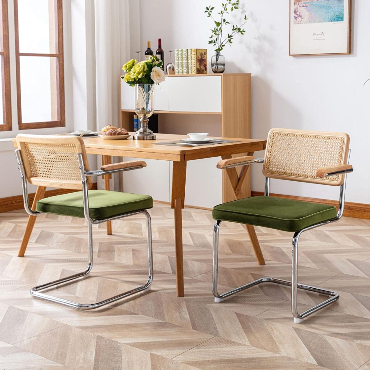 A green velvet cushion brings a pop of retro charm to this Cesca-inspired chair set. Each one is equipped with wood-accented armrests for added comfort. This chair is also available with a black cushion for those who want something a little more subtle.