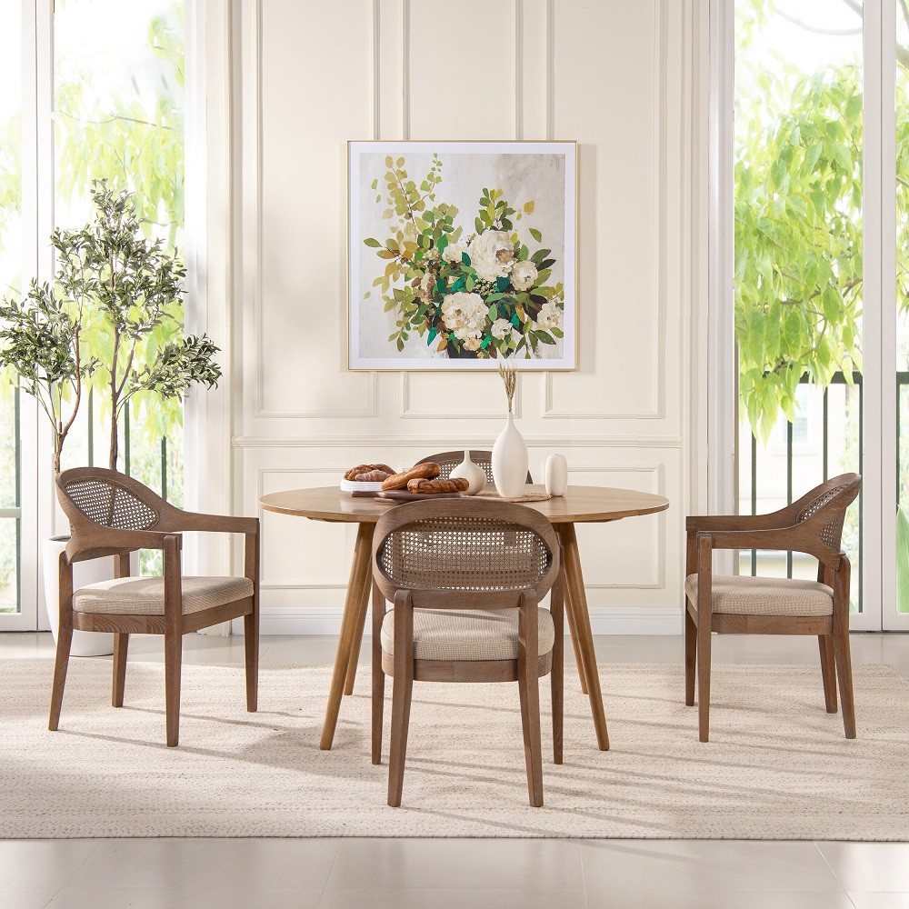 Smooth curved edges bring a calming aesthetic to this handsome dining chair design. The backrest is woven from natural rattan, the frame is sculpted from solid wood, and the seat is upholstered in an ivory linen over supportive foam. These chairs are also available in black.