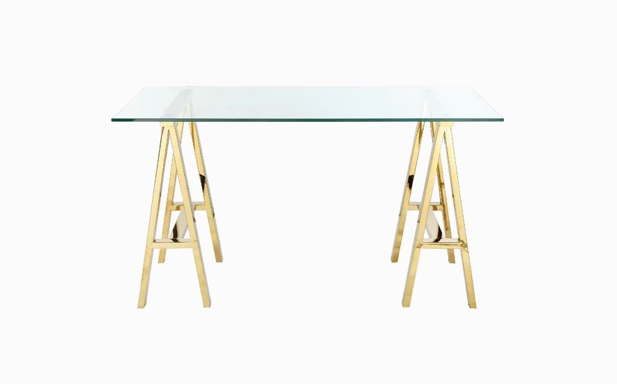 A chic high-end take on a charming rustic concept, this sawhorse dining table gleams with a hand-painted gold finish for glitz and glamour. This piece would make an adorable addition to interior styles ranging from upscale cottage chic to Scandinavian modern and more.