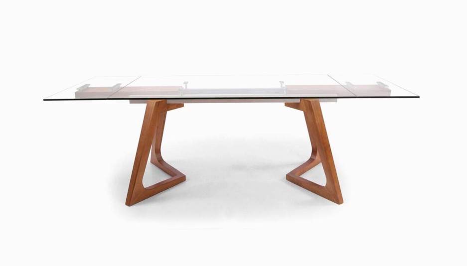 If you’re looking for an extendable dining table with a more classic look, this design might be worth your consideration. The sculptural legs are finished in a walnut veneer for warmth, with the top made from strong 10mm glass.