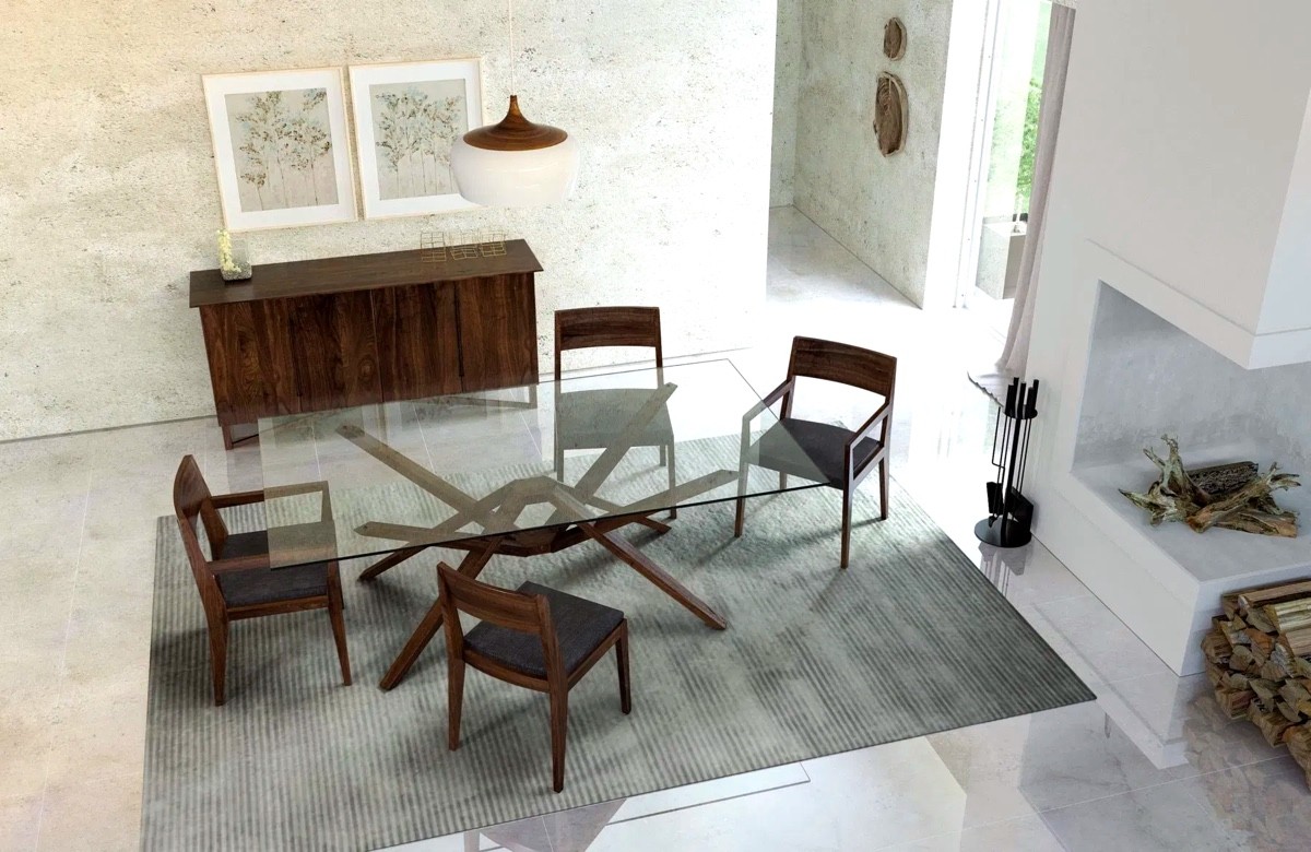 Crafted from solid American black walnut, the spectacular base of this dining table is built to last – an artisanal work of art with heirloom appeal. The flawlessly transparent glass tabletop offers an unblemished view of the sculptural forms and endlessly intricate wood grain below. Pictured with this table is a collection of Kyoto chairs by Copeland Furniture.