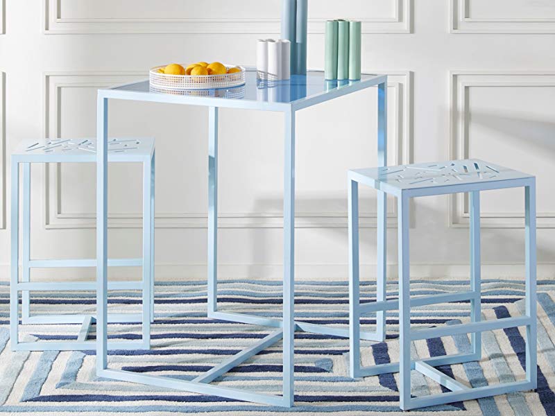 Looking for something a little different? This playful counter-height dining set features powder blue finishes over minimalistic framing. The tabletop glass is tinted brilliant cerulean to match. Each set comes with two stools that nest neatly below, a smart space-saving solution for small kitchens and breakfast nooks.