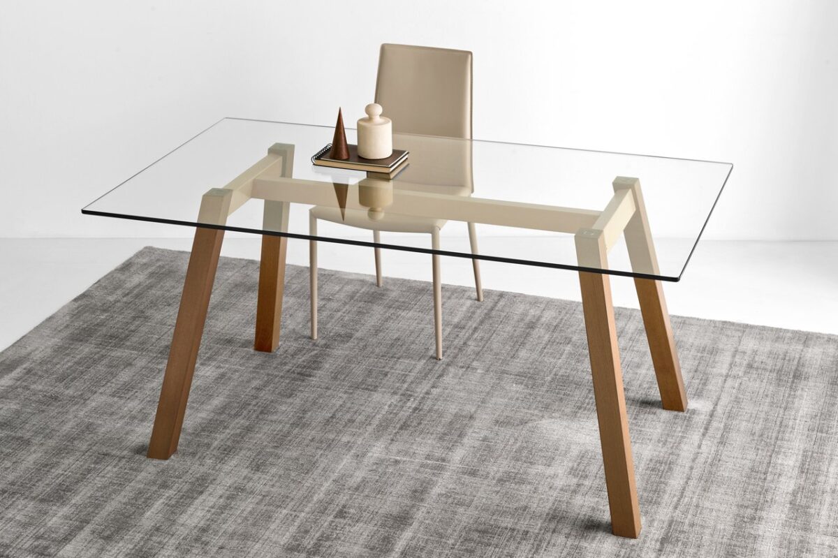 Connection is a dining table designed with architectural flair, its tapered wood base connected by an intricate trellis of tubular metal. The transparent glass tabletop that spans the construction serves as an open window through which one can admire the structural beauty below. Select your preferred combination of wood finishes and steel frame lacquer to create a customized fit for your interior style.