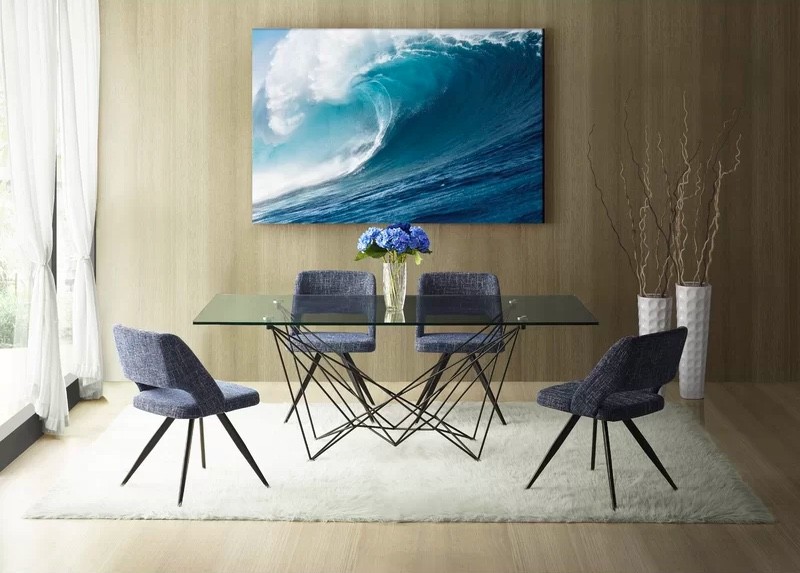 This dining set centers around a fascinating table, the thin wire base making the substantial glass tabletop look weightless. The chairs have significant decorative appeal of their own, the open back and tapered legs hinting at retro influence. Choose between gray or blue upholstery to best suit your dining room decor.