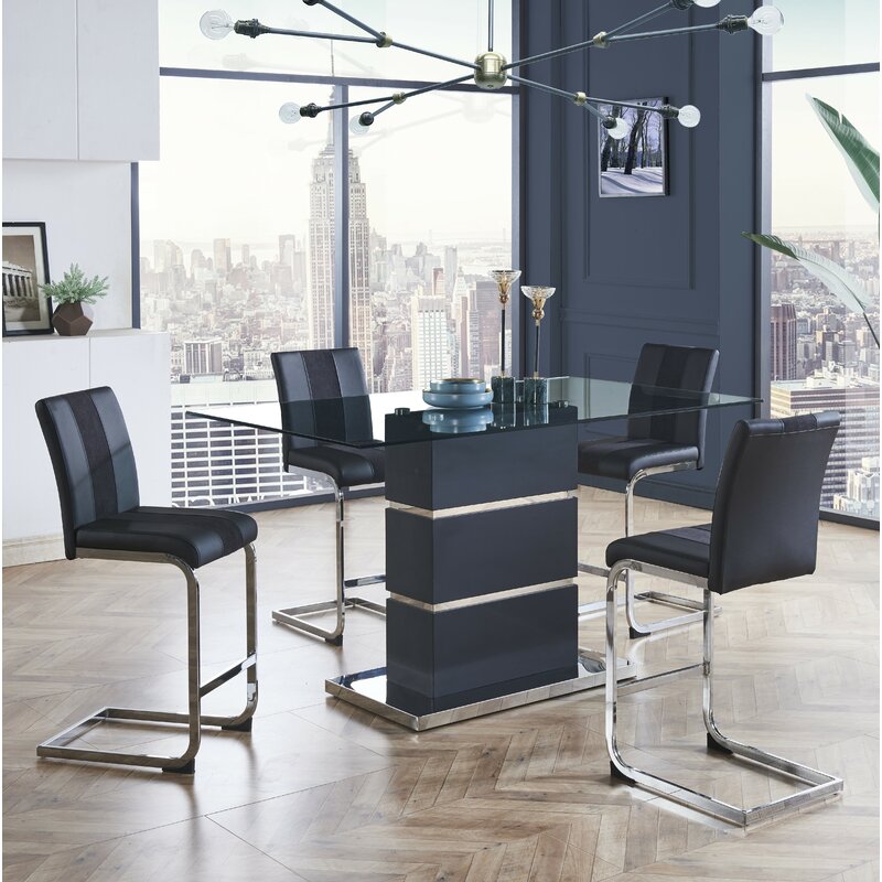 This counter-height dining set is ideal for eat-in kitchens. The top is spacious enough to serve as a dedicated formal dining table, while the chairs tuck neatly beneath to save space between uses. This set draws the eye with contemporary contrast between matte black finishes and glossy chrome, the smoky black glass tabletop completing the look.