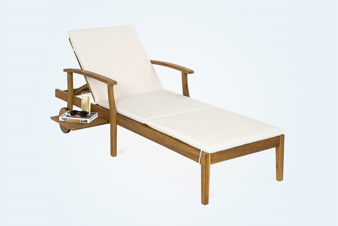 A traditional design with an outstanding amount of versatility thanks to its neutral color palette and wood frame. While this chair would look fantastic in most backyards, it especially lends itself well to modern setups. This design features an acacia wood frame, wheels, and a slide out side table.