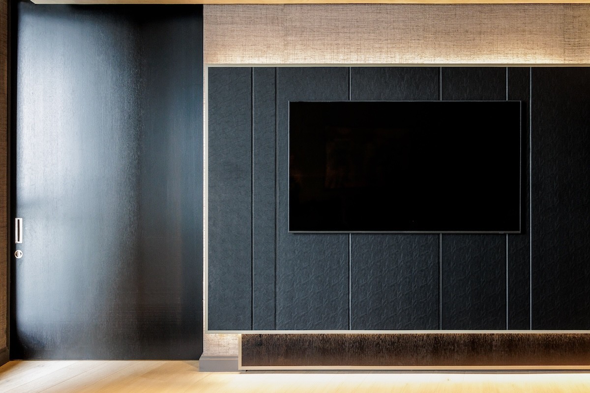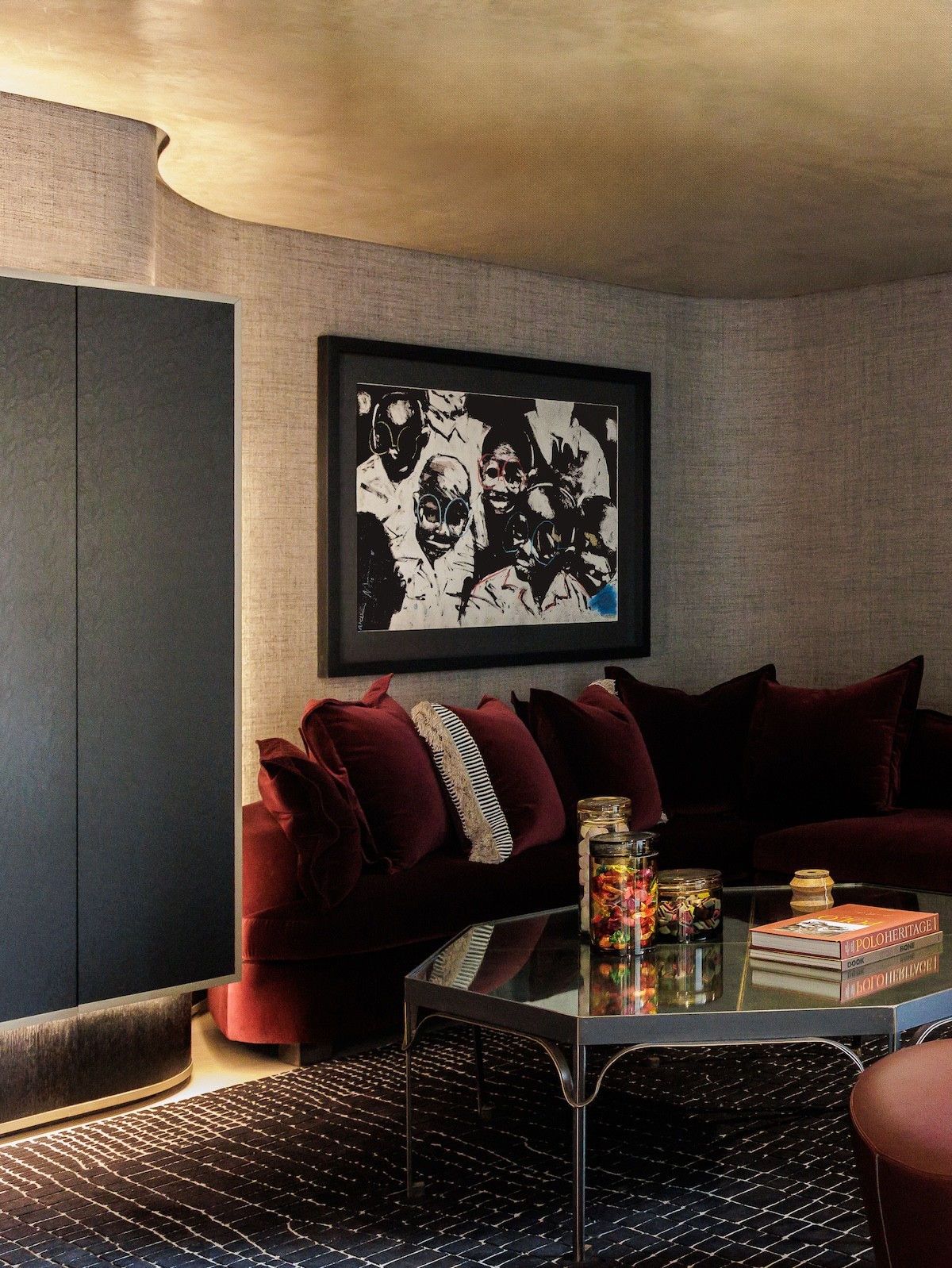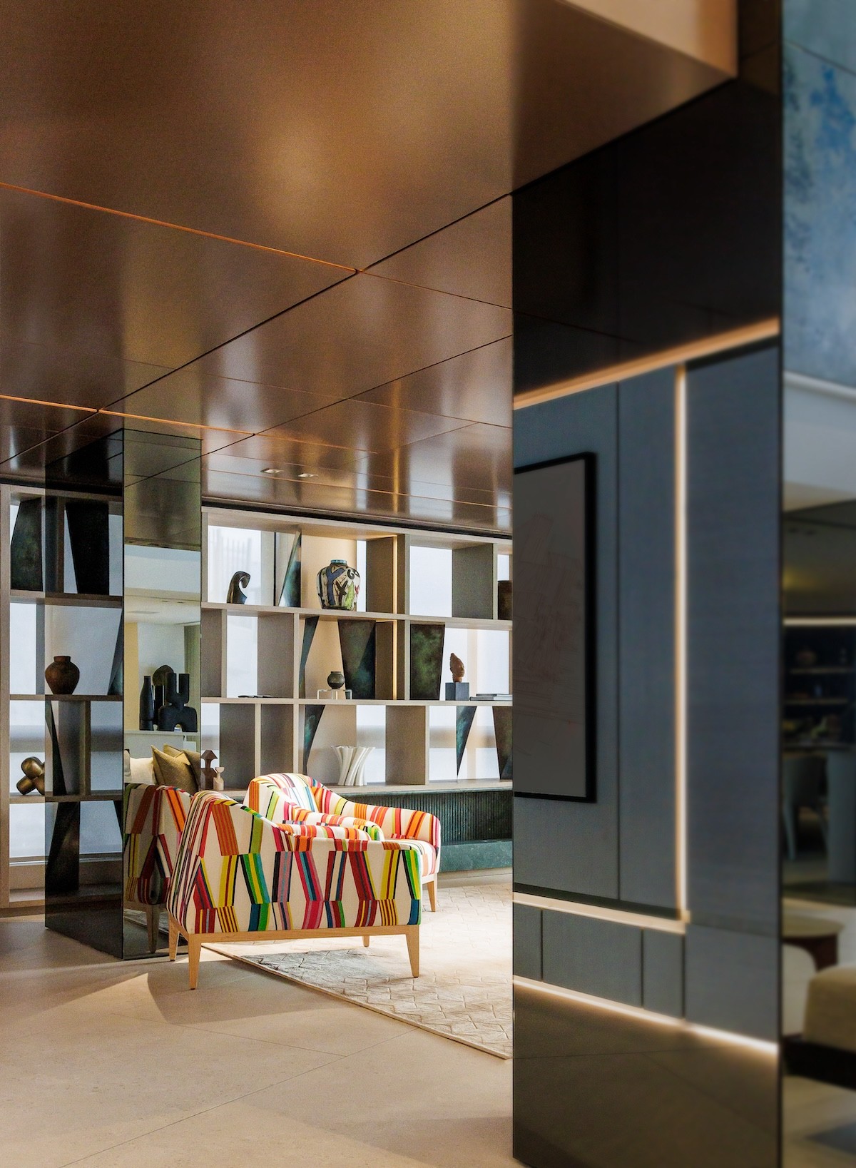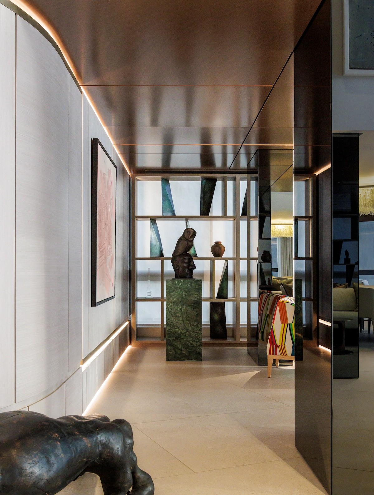 Behind the main living space, there is an intimate library nook, which nestles under a much lower and dramatically bronzed ceiling. Concealed lighting contributes to the treasure trove-like ambiance and guides the explorer through a hall of precious art.