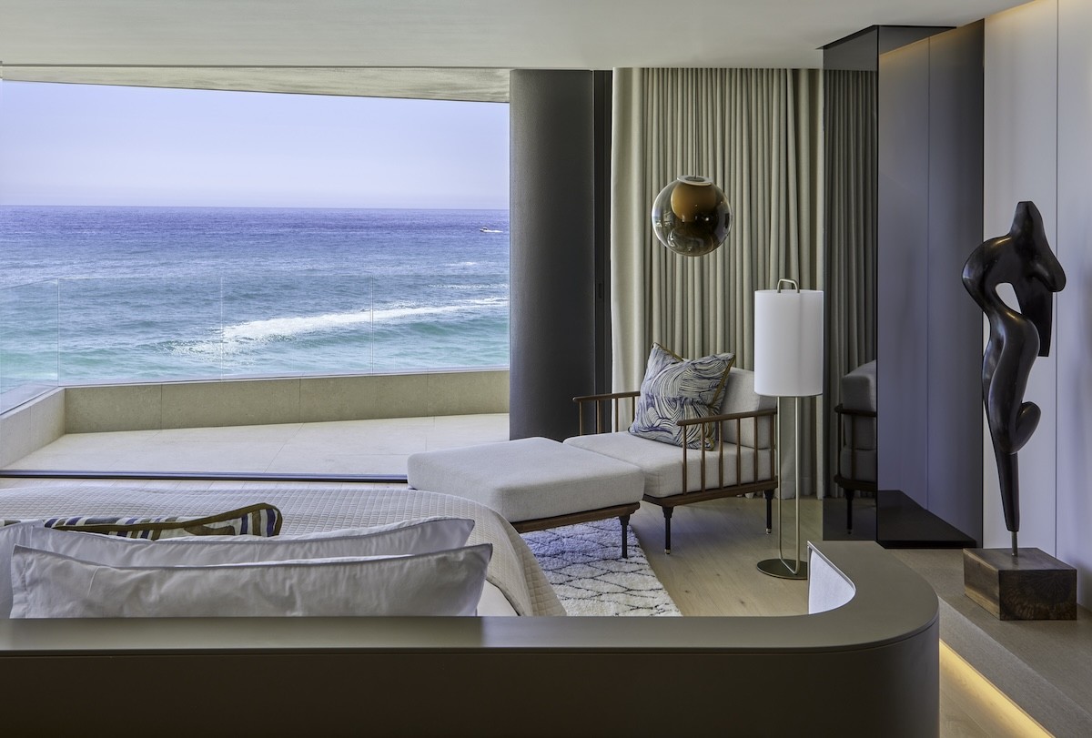 Just off the grand entrance on the top floor, the master bedroom boasts a wraparound view of a private beach. The bed is directed toward the panorama. A bedroom accent chair and ottoman set make up a bedroom reading area under a mesmerizing globe pendant light.