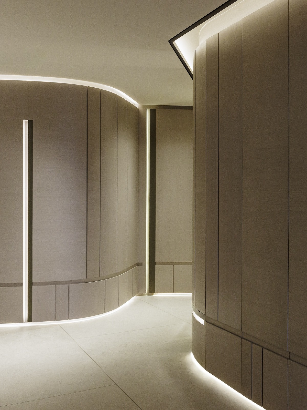 An LED ribbon illuminates the underside of the banister, throwing an inviting glow on the smooth wooden steps of the staircase. The wooden treads protrude beyond their risers, giving each one a lightweight, floating effect. Large format tiles clad the flanking wall of the hallway, accentuating the scale of the entryway.