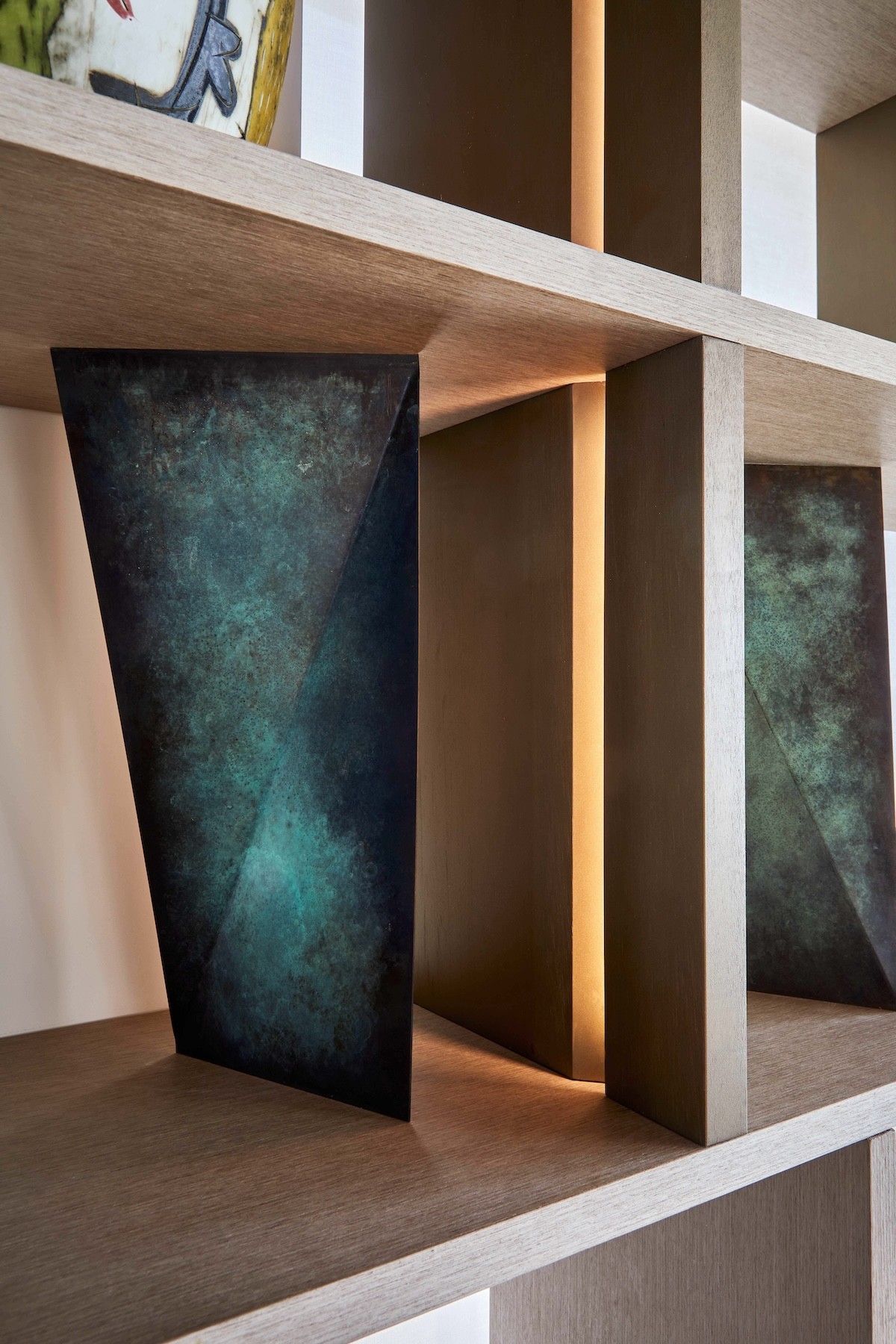 A custom-designed bookshelf is inspired by seashore discoveries, thematically linking the decor with the apartments premium location. Small ornaments and a collection of decorative vases line the intriguing, backlit display shelves
