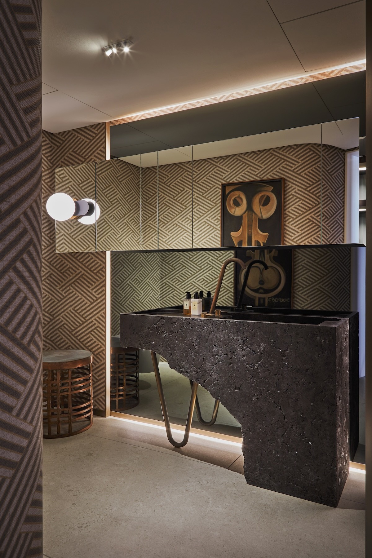 The guest bathroom features a unique, black stone vanity unit and copper bathroom faucet. Dainty soap and lotion dispensers adorn the countertop. The homeowner’s extensive contemporary art collection can be enjoyed in the confines of the bathroom too.
