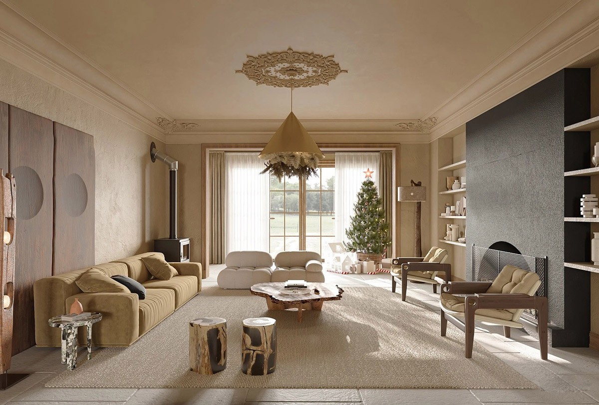 Earthy eclectic. Shades of cream, beige, slate gray, and rich natural wood tone come together to promote a grounded and earthy palette. This formal living room design combines rustic live edge furniture pieces within a neoclassical framed space to conjure the eclectic spirit. See more here.