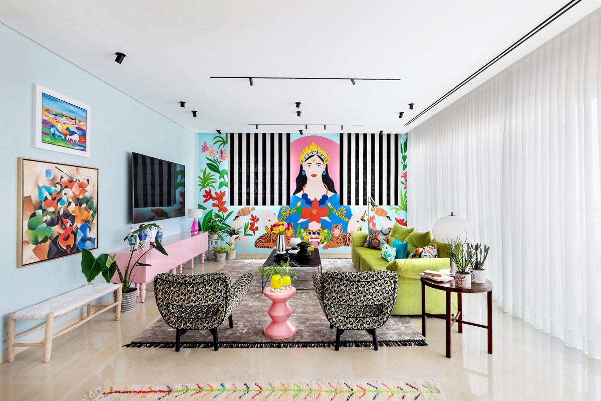 Amazing murals. The versatility of the eclectic interior aesthetic opens opportunities for the bold and the bizarre. This fabulous wall mural blooms with tropical vitality, which spills into the bright room palette. Color is infused at every possible opportunity here — from the living room table lamp to the planters on the small side table.