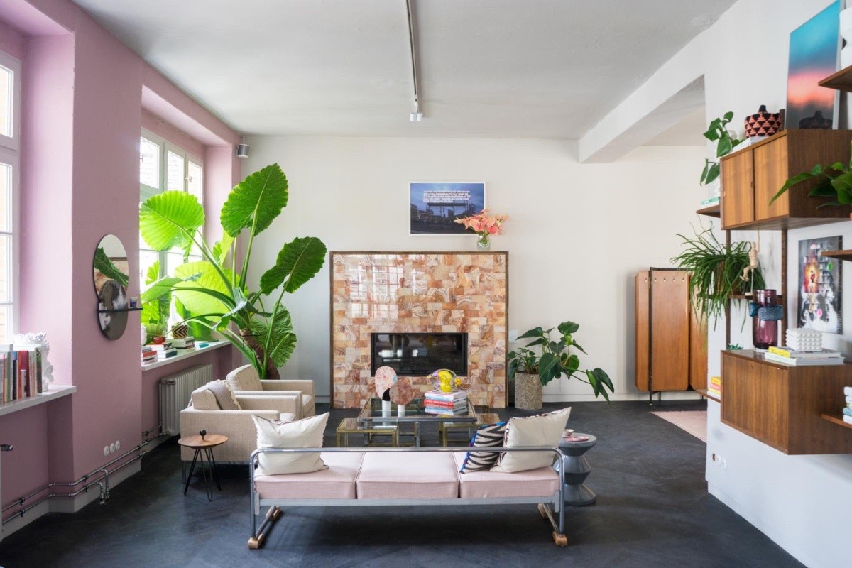 The statement fireplace. This orange-colored fireplace design stands out proudly from the busy curation of furniture and accessories in the room. A focal piece like this provides the eye with a place to rest in an abundance of things.
