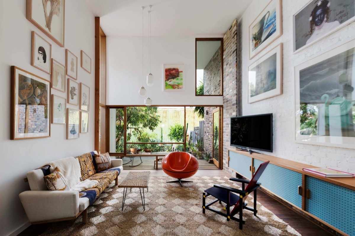 Eclectic gallery walls. The bigger the abundance of styles, frames, and color in an eclectic gallery wall, the better. An abundance of unique chairs and stools provide places to sit and observe. Need some help in mixing and matching colors? Go check out our post on living room color ideas.