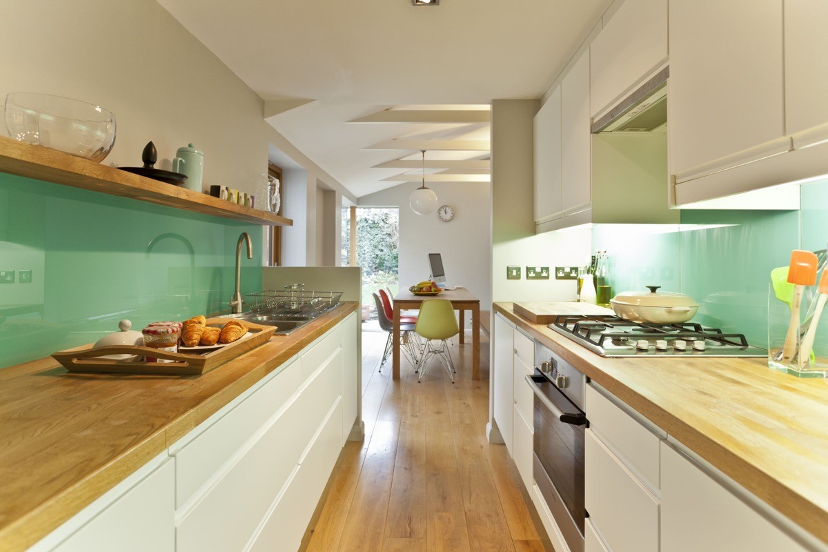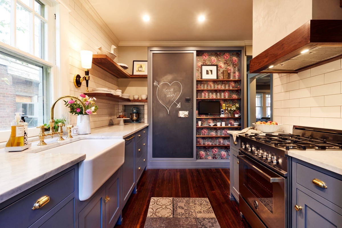 A chalkboard makes a cool and useful feature wall at the end of a kitchen galley space.