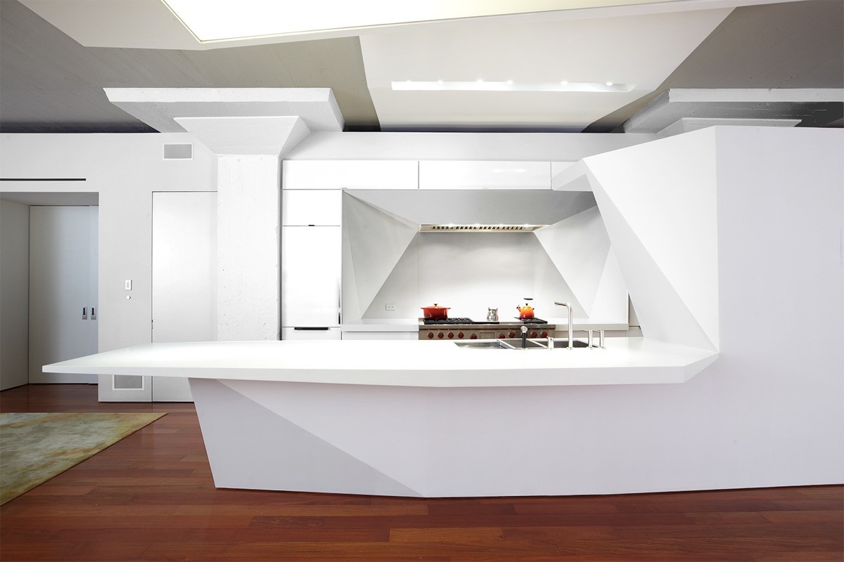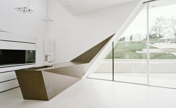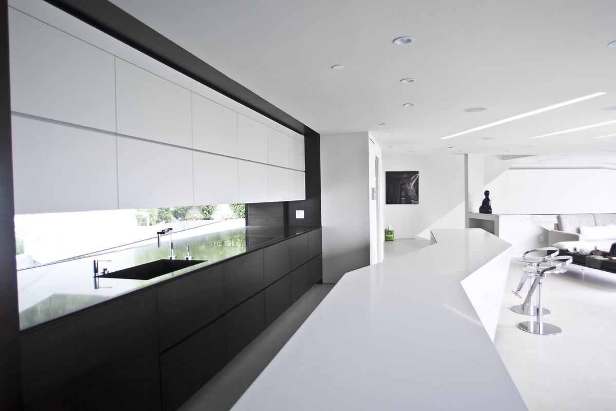 Think outside the box. This slanted futuristic kitchen bench skims straight over a slope in the floor.