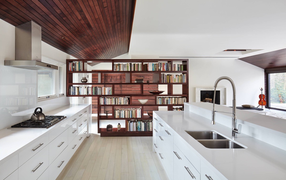 Introduce a wooden section to warm a white kitchen.