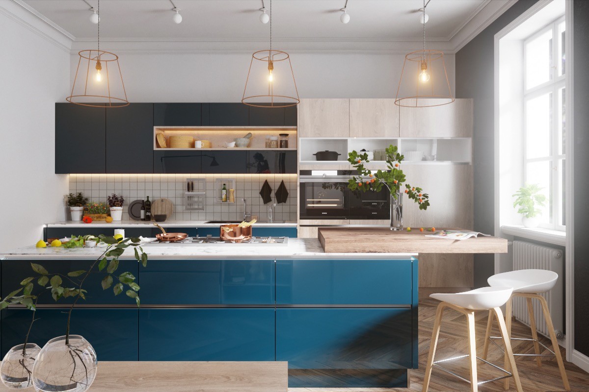 Go all out on a colour theme. This blue kitchen has the same shade of blue units, walls and ceiling.