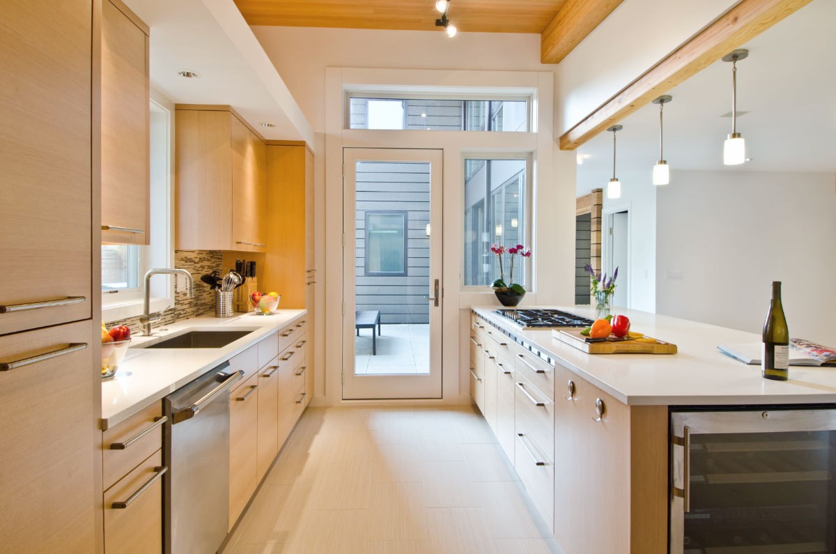 If you're all set to tackle the installation and decoration of a narrow kitchen, then this set of inspirational kitchen designs should be right up your galley! A galley kitchen is defined by two rows of cabinetry that face one another with a narrow walkway in between. The name is derived from the kitchen area of boats, where space is very limited. The domestic galley kitchen allows a lot of cabinetry to be squeezed into a sliver of culinary space, and can facilitate doors or walkways at either end of the run. It can be completely contained or be part of a larger open plan living space.